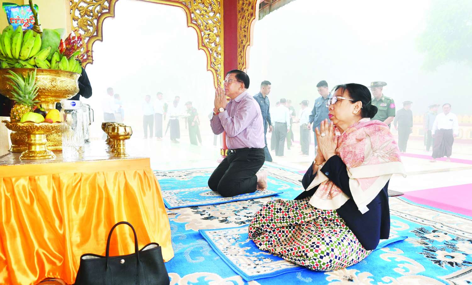 နိုင်ငံတော်စီမံအုပ်ချုပ်ရေးကောင်စီဥက္ကဋ္ဌနိုင်ငံတော်ဝန်ကြီးချုပ်နှင့် ဇနီး၊ အဖွဲ့ဝင်များသည် လွိုင်မွေတောင်စခန်းမြို့ရှိ စတုရဋ္ဌသုမင်္ဂလစေတီတော်သို့ ရောက်ရှိကြပြီး စေတီတော်မြတ်အား ဖူးမြော်ကြည်ညိုကာ ပန်း၊ ရေချမ်း၊ ဆီမီးကပ်လှူပူဇော်သည်။ ယင်းနောက် နိုင်ငံတော်စီမံအုပ်ချုပ်ရေးကောင်စီဥက္ကဋ္ဌ နိုင်ငံတော်ဝန်ကြီးချုပ်နှင့် ဇနီးတို့သည် စေတီတော်ဓမ္မာရုံတော်အတွင်းရှိ ဗုဒ္ဓရုပ်ပွားတော်မြတ်အား ဖူးမြော်ကြည်ညိုသည်။