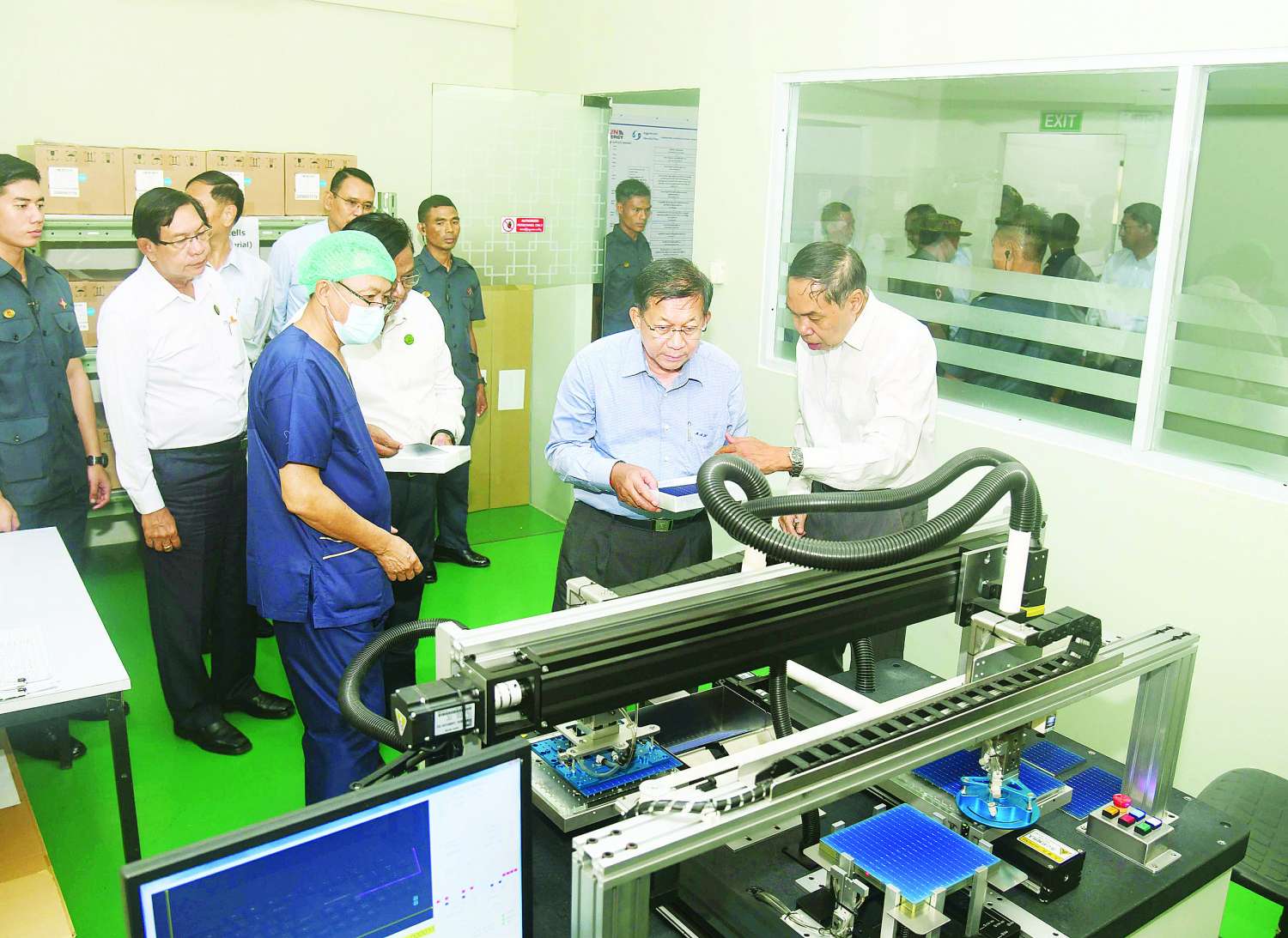 ဆက်လက်၍ ဆိုလာပြားစက်ရုံအတွင်း ဆိုလာပြားများ ထုတ်လုပ်နေမှုအဆင့်ဆင့်နှင့် ဆိုလာပြားစမ်းသပ်ထုတ်လုပ်ရန် ၂၀၂၁ ခုနှစ်မှစတင်၍ ဈေးကွက်အတွင်းမှ ဝယ်ယူ၍ လေ့လာခဲ့သည့် ဆိုလာပြားများနှင့် ကုမ္ပဏီမှ ထုတ်လုပ်ထားရှိသည့် ဆိုလာပြားများအား လှည့်လည်ကြည့်ရှုစစ်ဆေးပြီး တာဝန်ရှိသူများ၏ တင်ပြချက်များအပေါ် လိုအပ်သည်များ လမ်းညွှန်မှာကြားသည်။
