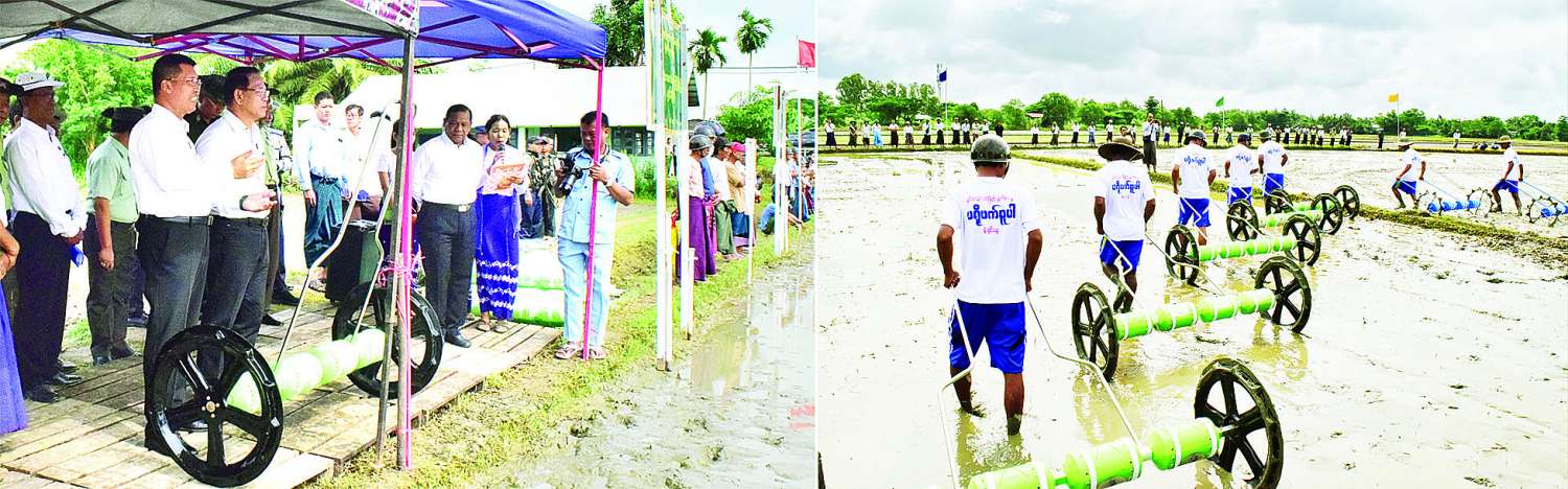 ဦးစွာ ဧရာဝတီတိုင်းဒေသကြီး ညောင်တုန်းမြို့နယ် ဆားမလောက်ကျေးရွာရှိ နည်းပညာပြန့်ပွားရေးစင်တာ (Knowledge Center) သို့ ရောက်ရှိပြီး တောင်သူများ မျိုးစေ့ချကိရိယာ (Drum Seeder) ဖြင့် မျိုးစေ့ချသရုပ်ပြပွဲကို ကြည့်ရှုအားပေးကာ ပြည်ထောင်စုဝန်ကြီးနှင့် တိုင်းဒေသကြီးဝန်ကြီးချုပ်တို့က ဆားမလောက်ရွာ၊ သက်ရင်းကျောင်းရွာ၊ ဇီးဖြူကျွန်းရွာ၊ ဝါးတောရွာ၊ ထူးချောင်းရွာတို့မှ တောင်သူများအား မျိုးစေ့ချကိရိယာနှင့် MRTV DTH စလောင်းများကို ပေးအပ်ကြသည်။
