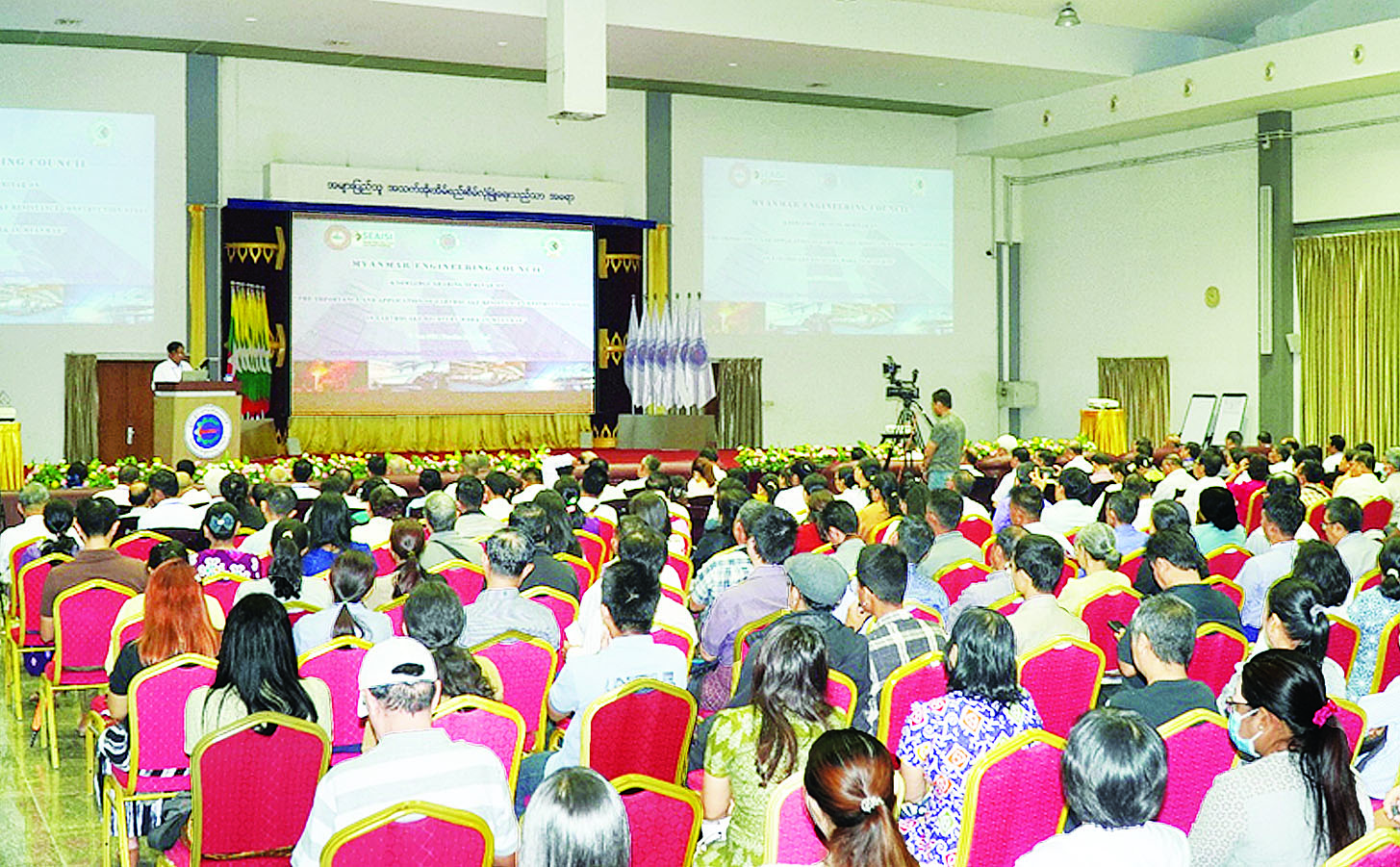 ငလျင်အပြီး ပြန်လည်ထူထောင်ရေးလုပ်ငန်းများ၌ ငလျင်ဒဏ်ခံနိုင်သော ဆောက်လုပ်ရေးလုပ်ငန်းသုံး သံမဏိများ၏ အရေးပါမှုနှင့်အသုံးပြုနိုင်မှု” အသိပညာပေးဆွေးနွေးပွဲကို ယနေ့နံနက်ပိုင်းတွင် ရန်ကုန်တိုင်းဒေသကြီး လမ်းမတော်မြို့နယ်ရှိ မြန်မာနိုင်ငံအင်ဂျင်နီယာကောင်စီရုံး၌ ကျင်းပသည်။