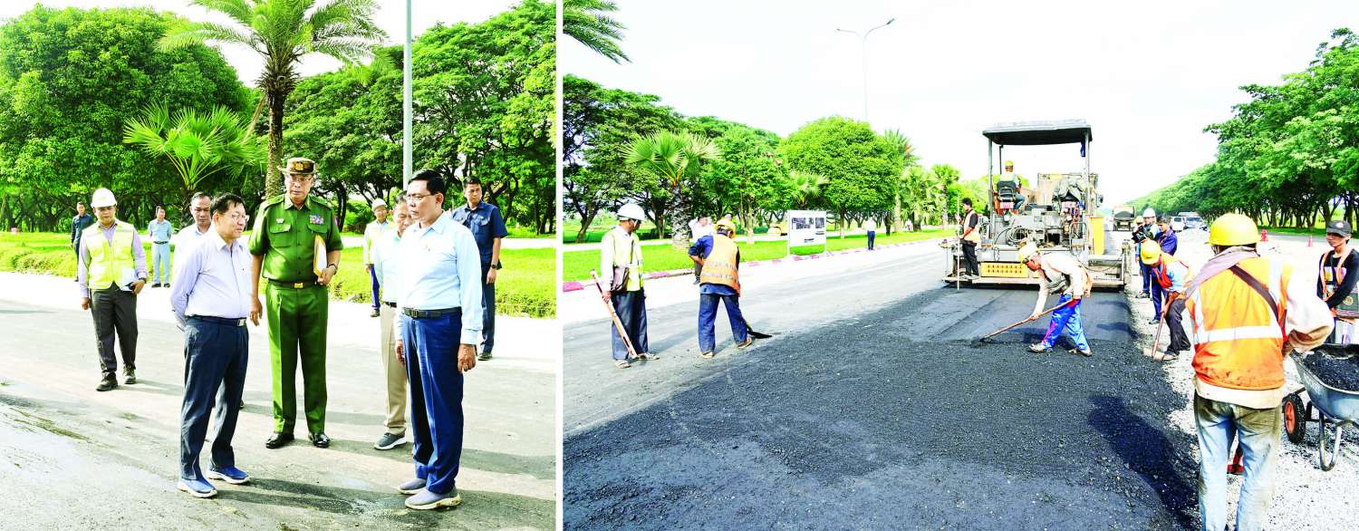 ထိုသို့ကြည့်ရှုစစ်ဆေးရာတွင် နိုင်ငံတော်စီမံအုပ်ချုပ်ရေးကောင်စီဥက္ကဋ္ဌ နိုင်ငံတော်ဝန်ကြီးချုပ်အား ကာကွယ်ရေးဦးစီးချုပ်ရုံး (ကြည်း) စစ်အင်ဂျင်နီယာညွှန်ကြားရေးမှူးရုံး ညွှန်ကြားရေးမှူး ဗိုလ်ချုပ်ဇော်နိုင်ဦးနှင့်တာဝန်ရှိသူများက ရာဇဌာနီလမ်းမကြီးပေါ်ရှိ ပန်းခင်းလမ်းမီးပွိုင့် လမ်းဆုံမှ ကုမုဒြာကြာပန်းအဝိုင်းအထိ ကွန်ကရစ်လမ်းပျက်စီးမှုအား စက်ယန္တရားများအသုံးပြု၍ ကျောက်ကတ္တရာခင်းခြင်းလုပ်ငန်း ဆောင်ရွက်နေမှုအခြေအနေများကို ရှင်းလင်းတင်ပြသည်။