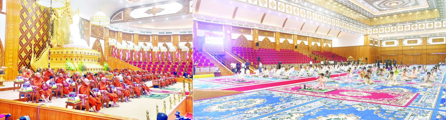 နိုင်ငံတော်စီမံအုပ်ချုပ်ရေးကောင်စီ ၂၀၂၅ ခုနှစ် ဝါဆိုသင်္ကန်းဆက်ကပ်လှူဒါန်းပွဲနှင့် မာရဝိဇယဗုဒ္ဓရုပ်ပွားတော်မြတ်ကြီး ဗုဒ္ဓဘိသေကအနေကဇာတင် အောင်ပွဲ(၂)နှစ်ပြည့် အခမ်းအနားကို ယနေ့နံနက်ပိုင်းတွင် နေပြည်တော်၊ မာရဝိဇယဗုဒ္ဓဥယျာဉ်တော် ပရိဝုဏ်အတွင်းရှိ အဂ္ဂါဓိပတိသာသနာ့ဗိမာန်တော်ကြီး၌ကျင်းပရာ နိုင်ငံတော်စီမံအုပ်ချုပ်ရေးကောင်စီဥက္ကဋ္ဌ နိုင်ငံတော်ဝန်ကြီးချုပ် ဗိုလ်ချုပ်မှူးကြီး မင်းအောင်လှိုင်နှင့် ဇနီးဒေါ်ကြူကြူလှတို့ တက်ရောက်ကြည်ညိုပြီး ဝါဆိုသင်္ကန်းနှင့်လှူဖွယ်ပစ္စည်းများ ဆက်ကပ်လှူဒါန်းသည်။