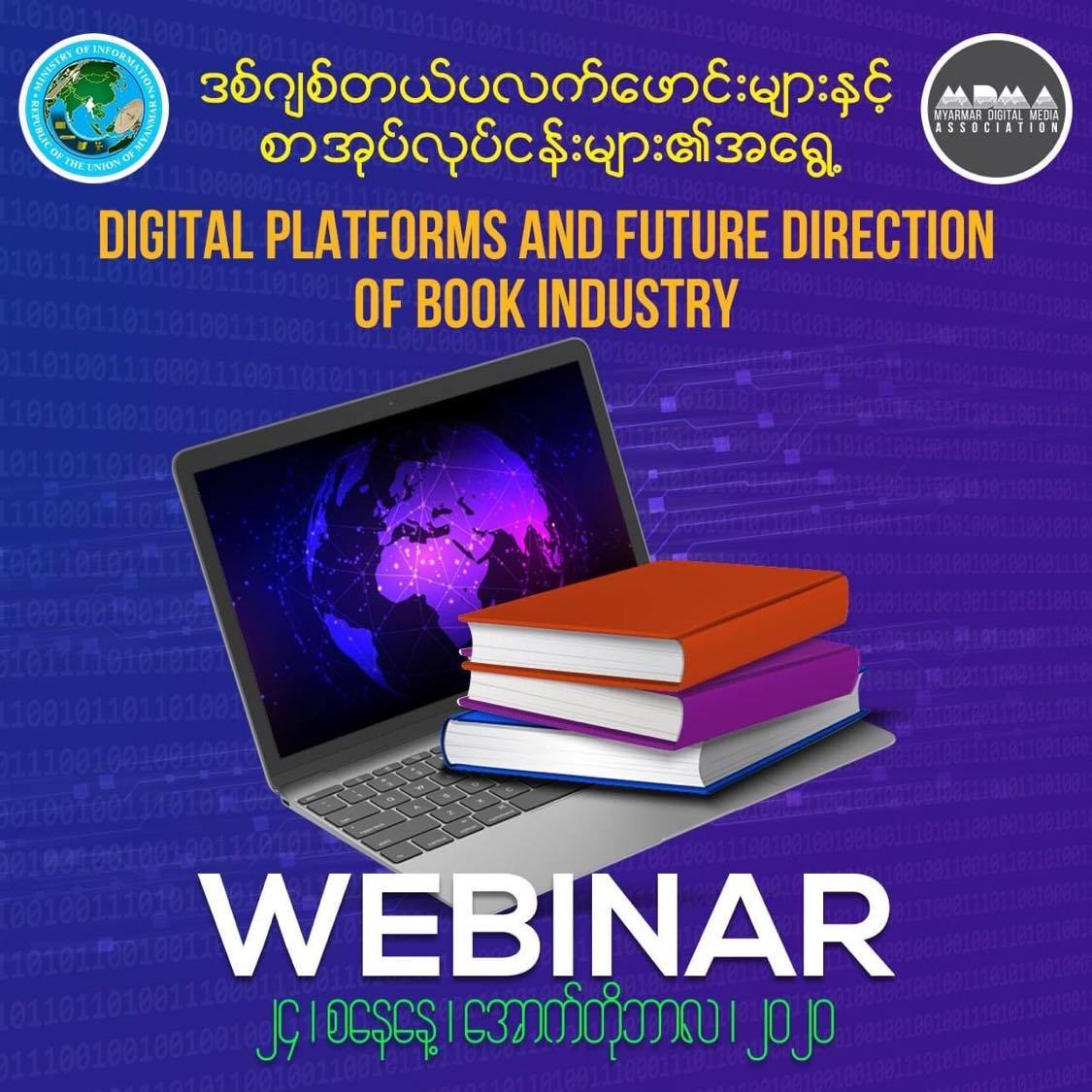 မြန်မာနိုင်ငံ ဒီဂျစ်တယ်မီဒီယာအသင်းဖြစ်မြောက်ရေး ကော်မတီက စီစဉ်ကျင်းပမည့်ဒီဂျစ် တယ်ပလက်ဖောင်းများနှင့် စာအုပ်လုပ်ငန်းများ၏ အရွေ့ (Digital Platforms and Future Direction of Book Industry Webinar)” အွန်လိုင်းဆွေးနွေးပွဲကို ၂၄၁၀၂၀၂၀(စနေနေ့) မွန်းလွဲ ()နာရီတွင် ကျင်းပမည်ဖြစ်သည်။