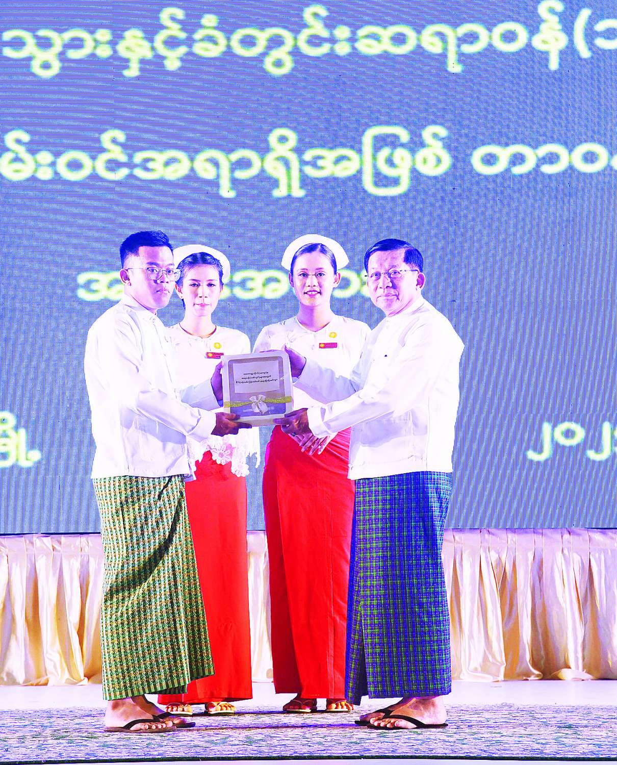 ၎င်းနောက် နိုင်ငံတော်စီမံအုပ်ချုပ်ရေးကောင်စီဥက္ကဋ္ဌ နိုင်ငံတော်ဝန်ကြီးချုပ်က ဆေးတက္ကသိုလ် ၄ ခုမှ ကိုယ်စားလှယ်များအား နိုင်ငံ့ဝန်ထမ်းပြန်တမ်းဝင်အရာရှိခန့်လွှာများ ပေးအပ်ရာ တက္ကသိုလ်တစ်ခုချင်းစီလိုက် ကိုယ်စားလှယ်များက လက်ခံရယူကြသည်။