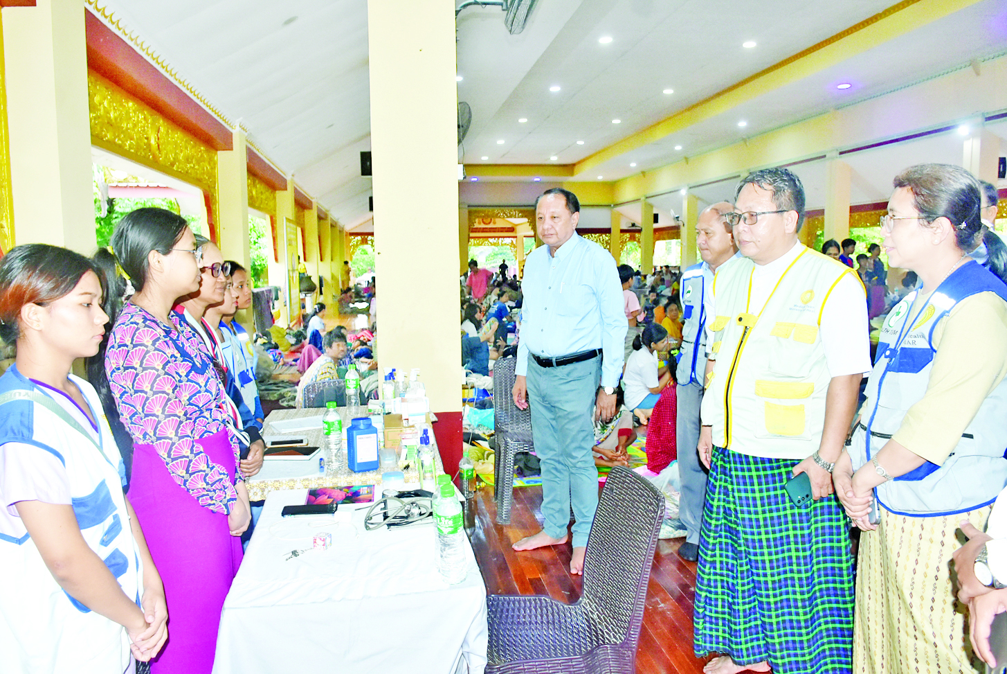 ဦးစွာ ဗဟိုကွင်းဆင်းအဖွဲ့သည် ယာယီရေဘေးရှောင်စခန်းများ၌ ကျန်းမာရေး စောင့်ရှောက်မှုပေးနေသော ယာယီဆေးခန်းများ နှင့် အသင့်စားထမင်းဘူးများ ဝေငှပေးနေမှုတို့ကို ကြည့်ရှုစစ်ဆေး ပြီး ကျန်းမာရေးဝန်ထမ်းများအတွက် ထောက်ပံ့ငွေများနှင့် ရေဘေးရှောင်ပြည်သူများအတွက် အိမ်ထောင်စုအလိုက် ဆေးစိမ်ခြင်ထောင်နှင့် စားသောက်ဖွယ်ရာများပေးအပ်ပြီး ရေဘေးရှောင် ပြည်သူများအနေဖြင့် ကူးစက်ရောဂါကာကွယ်ရေးလုပ်ငန်းများတွင် ပူးပေါင်းပါဝင်ဆောင်ရွက်ရန်၊ အစားအစာသန့်ရှင်းရေး၊ သောက်သုံးရေ သန့်ရှင်းရေး၊ ပတ်ဝန်းကျင် န့်ရှင်းရေးနှင့် တစ်ကိုယ်ရေ သန့်ရှင်းရေးလုပ်ငန်းများကို အလေးထားဆောင်ရွက်ရန် ဆွေးနွေးမှာကြားခဲ့ကြောင်း သိရသည်။
