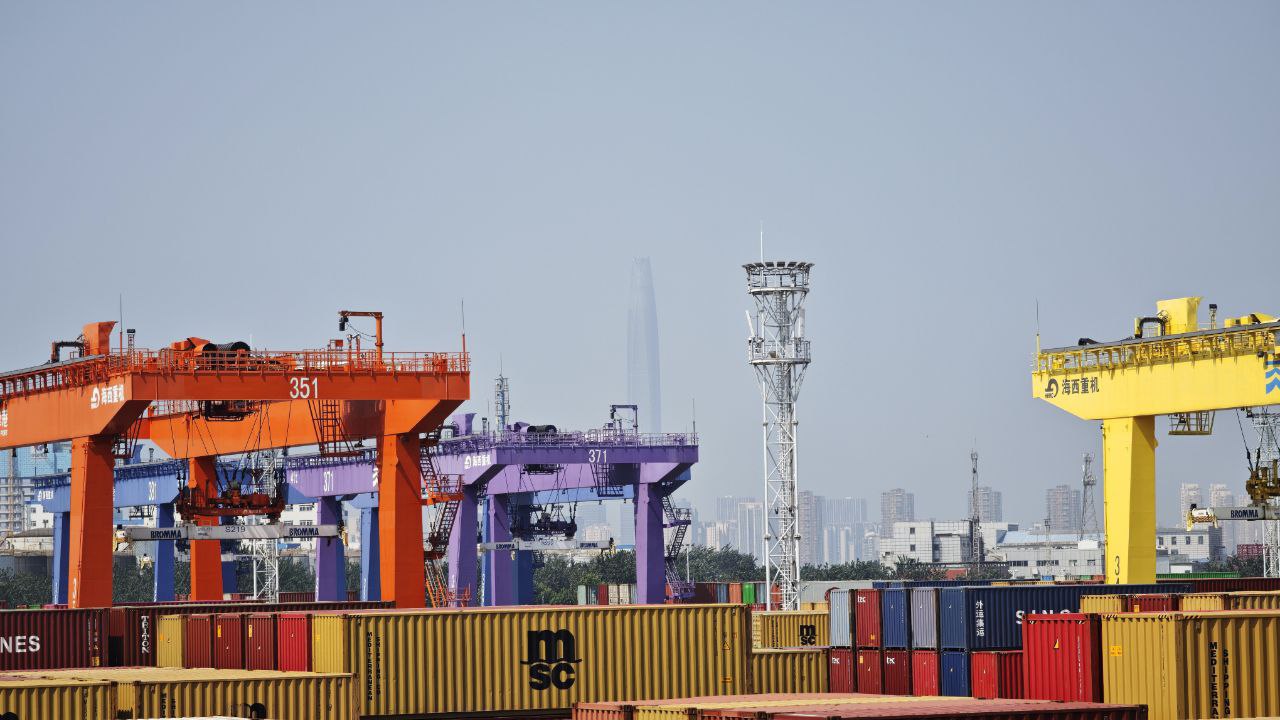 ယင်းနောက် ဆိပ်ကမ်းမှ AI စနစ်သုံး ကွန်တိန်နာတင်ဆောင်သည့် ယာဉ်များဖြင့် ရှန်ဟိုင်းပူးပေါင်းဆောင်ရွက်မှုအဖွဲ့ ထိပ်သီးအစည်းအဝေး (Shanghai SCO SUMMIT 2025) အထိမ်းအမှတ်အဖြစ် SCO စာလုံးအား သရုပ်ဖော်ပြသကြသည်။