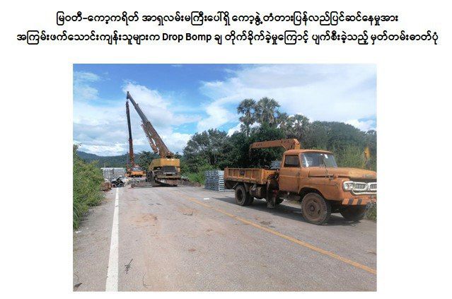 ကော့ကရိတ်-မြဝတီသွား အာရှလမ်းမကြီးပေါ်ရှိ ကော့နွဲ့တံတား ပြုပြင်ရေးအဖွဲ့အား KNU နှင့် PDF အမည်ခံအကြမ်းဖက်သမားများက Suicide Drone များဖြင့် ပစ်ချတိုက်ခိုက်