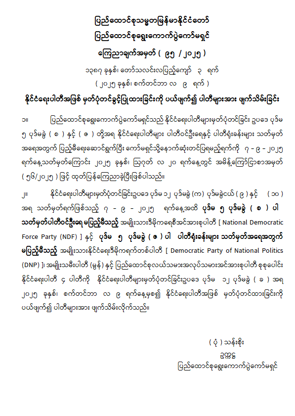 နိုင်ငံရေးပါတီအဖြစ် မှတ်ပုံတင်ခွင့်ပြုထားခြင်းကို ပယ်ဖျက်၍ ပါတီများအား ဖျက်သိမ်းခြင်း