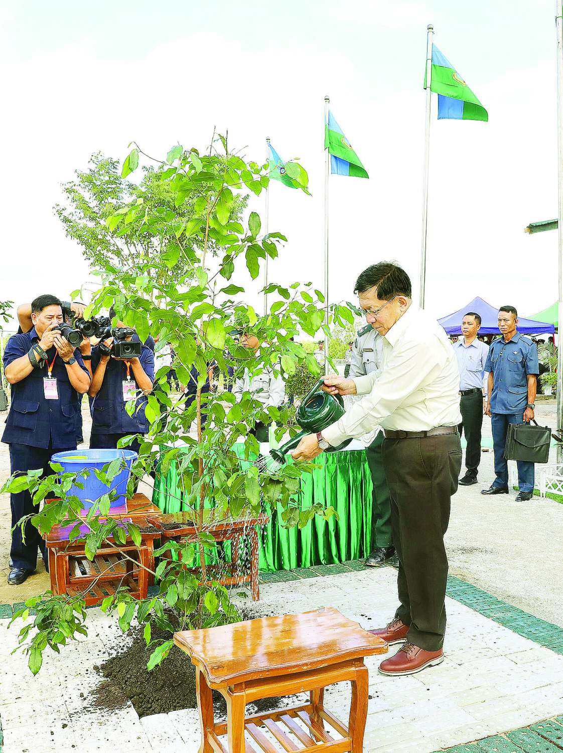 ပြည်ထောင်စုသမ္မတမြန်မာနိုင်ငံတော် ယာယီသမ္မတ နိုင်ငံတော်လုံခြုံရေးနှင့်အေးချမ်းသာယာရေးကော်မရှင်ဥက္ကဋ္ဌ ဗိုလ်ချုပ်မှူးကြီး မင်းအောင်လှိုင် ပြည်ထောင်စုနယ်မြေ၊ နေပြည်တော် ၂၀၂၅ ခုနှစ်၊ တတိယအကြိမ် မိုးရာသီသစ်ပင်စိုက်ပျိုးပွဲသို့ တက်ရောက်၍ ခရေပျိုးပင်အား ဦးဆောင်စိုက်ပျိုးပေး