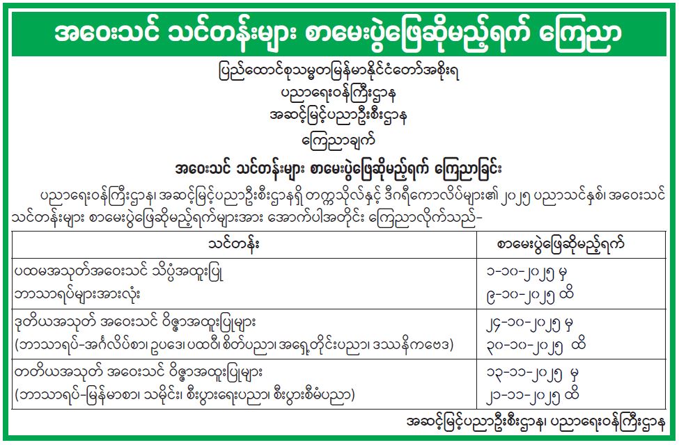 အဝေးသင် သင်တန်းများ စာမေးပွဲဖြေဆိုမည့်ရက် ကြေညာခြင်း