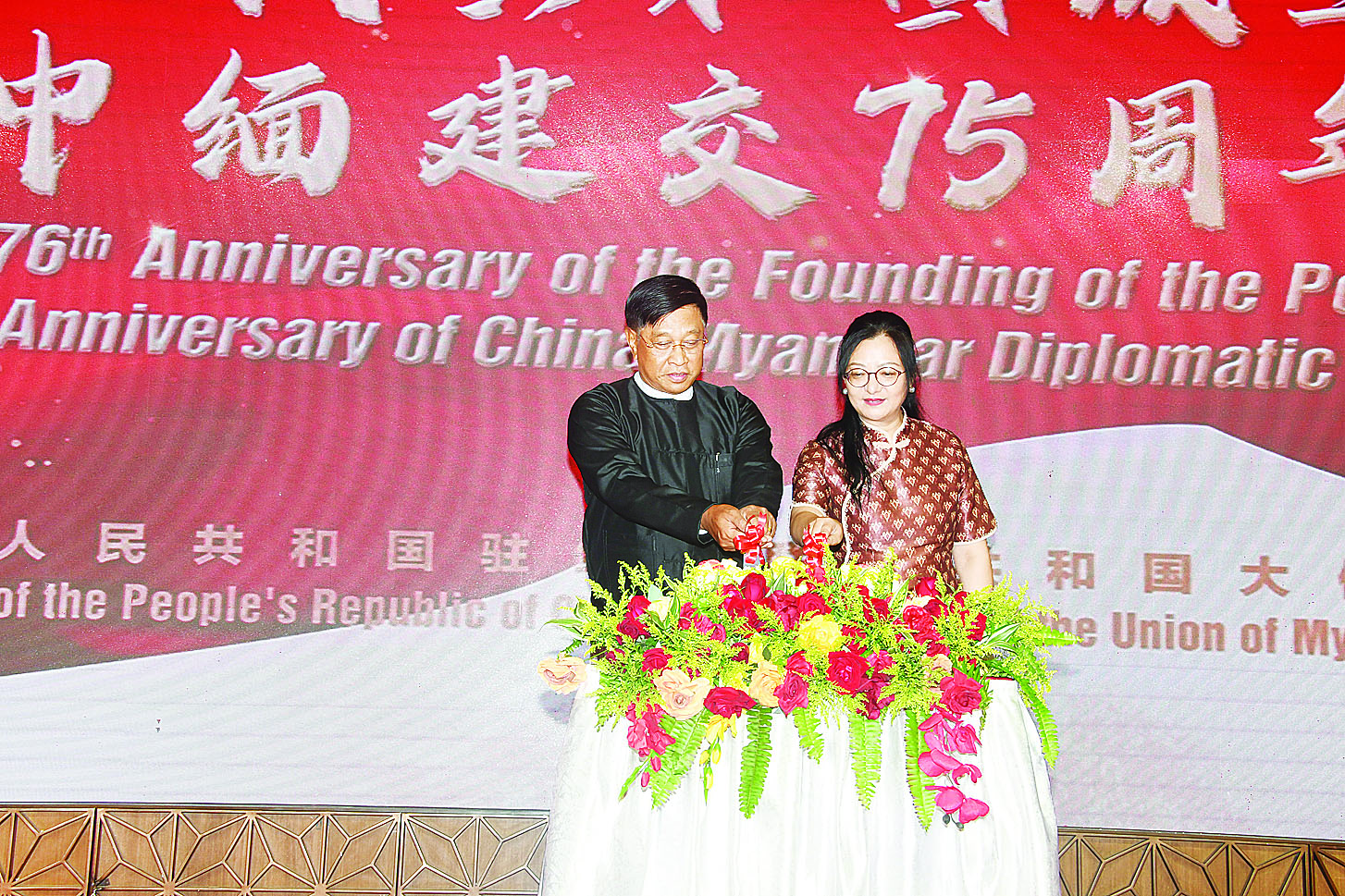 ဆက်လက်၍ ပြည်ထောင်စုဝန်ကြီးနှင့် တရုတ်နိုင်ငံ သံအမတ်ကြီးတို့က တရုတ်ပြည်သူ့သမ္မတနိုင်ငံတည်ထောင်သည့် (၇၆) နှစ်မြောက် နှစ်ပတ်လည်နှင့် မြန်မာ-တရုတ် သံတမန်ဆက်ဆံရေး (၇၅) နှစ်ပြည့် အထိမ်းအမှတ်ကိတ်မုန့်ကို လှီးဖြတ်ပေးကြပြီး သံအမတ်ကြီးက တက်ရောက်လာကြသည့် ဧည့်သည်တော်များအား ညစာစားပွဲဖြင့် တည်ခင်းဧည့်ခံသည်။