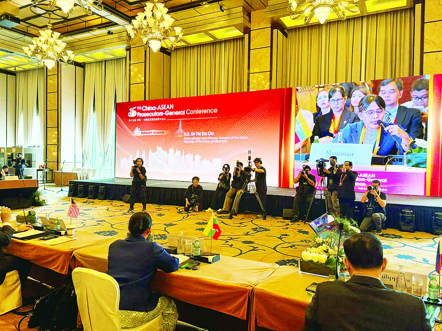 (၁၅)ကြိမ်မြောက် တရုတ် - အာဆီယံရှေ့နေချုပ်များညီလာခံကို “နည်းပညာခေတ်တွင် ငွေကြေးခဝါချမှုနှင့် အဂတိလိုက်စားမှုများကို တိုက်ဖျက်ခြင်းနှင့် ပိုင်ဆိုင်မှုပစ္စည်းများကို ပြန်လည်ရယူခြင်း” ခေါင်းစဉ်ဖြင့်ကျင်းပရာ ပြည်ထောင်စုဝန်ကြီးနှင့် ပြည်ထောင်စုရှေ့နေချုပ် ဒေါက်တာသီတာဦးက တရုတ်-အာဆီယံရှေ့နေချုပ်များညီလာခံသည် ၂၀၀၄ ခုနှစ်တွင်စတင်ခဲ့ပြီး နှစ်ပေါင်း ၂၀ ရှိပြီဖြစ်ပါကြောင်း၊ ဤညီလာခံသည် နိုင်ငံတကာ ဥပဒေရေးရာပူးပေါင်းဆောင်ရွက်မှုများ မြှင့်တင်ရန်နှင့် နိုင်ငံဖြတ်ကျော်ပြီး ကျူးလွန်သော ပြစ်မှုဆိုင်ရာ ကိစ္စရပ်များကို ဖြေရှင်းရန်အတွက် အရေးပါသော ပလက်ဖောင်းတစ်ခုဖြစ်ပါကြောင်း၊ ညီလာခံခေါင်းစဉ်အပေါ် အကောင်အထည်ဖော်ဆောင်ရွက်နိုင်ရေးအတွက် အာဆီယံအဖွဲ့ဝင်နိုင်ငံများအကြားတွင်သာမက တရုတ်နိုင်ငံနှင့် အာဆီယံအဖွဲ့ဝင်နိုင်ငံများအကြား ဥပဒေရေးရာပူးပေါင်း ဆောင်ရွက်မှုများလိုအပ်ပါကြောင်း၊ ကုလသမဂ္ဂအဂတိလိုက် စားမှုတိုက်ဖျက်ရေးကွန်ဗင်းရှင်းကို အတည်ပြုချမှတ်နိုင်ခြင်းသည် အဂတိလိုက်စားမှုကို ကိုင်တွယ်ဖြေရှင်းရန် ပြီးပြည့်စုံသောချဉ်းကပ်မှုတစ်ခုဖြစ်ပါကြောင်း။