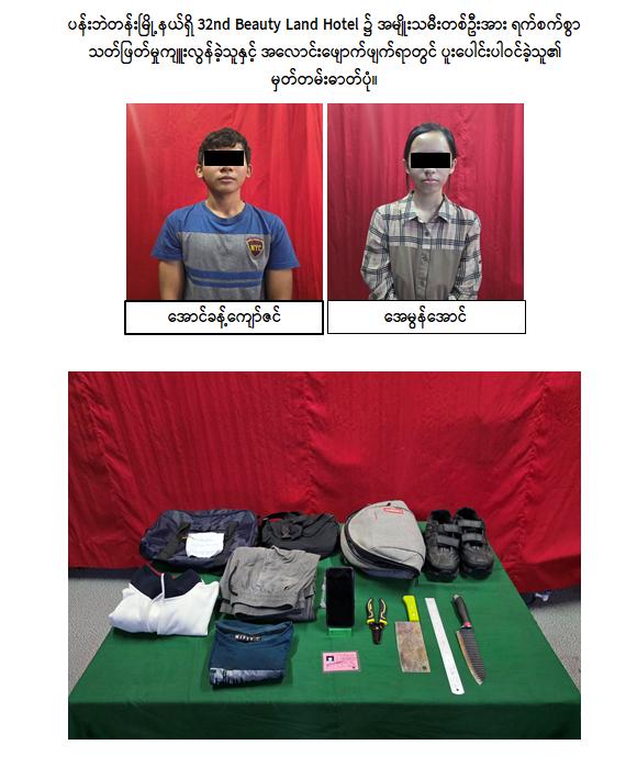 ပြစ်မှုကျူးလွန်သူများကို ဖော်ထုတ်ဖမ်းဆီးရမိနိုင်ရေး လုံခြုံရေးတပ်ဖွဲ့ဝင်များက စုံစမ်းဖော်ထုတ်ခြင်းများဆောင်ရွက်ခဲ့ရာ သေဆုံးသူမှာ ပဲခူးတိုင်းဒေသကြီး၊ နတ်တလင်းမြို့နယ်နေ မစုမြတ်ဝင်း (၂၃)နှစ်ဖြစ်ကြောင်းနှင့် ပြစ်မှုကျူးလွန်သူများမှာ သာကေတမြို့နယ်၊ အမှတ်(၇)အရှေ့ရပ်ကွက်နေ အောင်ခန့်ကျော်ဇင်(၁၈)နှစ်နှင့် ၎င်း၏ရည်းစားဖြစ်သူ ဗဟန်းမြို့နယ်၊ အရှေ့ရွှေဂုံတိုင်ရပ်ကွက်၊ အောင်ချမ်းသာအိမ်ရာနေ အေမွန်အောင်(၁၈)နှစ်တို့ဖြစ်ကြောင်း စုံစမ်းဖော်ထုတ်သိရှိရသဖြင့် ဖမ်းဆီးရမိနိုင်ရေး ဆက်လက်ဆောင်ရွက်ခဲ့ရာ ၎င်းတို့နှစ်ဦးအား အောက်တိုဘာလ ၇ ရက်နေ့ နေ့လယ်ပိုင်းတွင် ၎င်းတို့၏နေအိမ်အသီးသီး၌ ဖမ်းဆီးရမိခဲ့ပြီး အောင်ခန့်ကျော်ဇင်၏ နေအိမ်မှ ပြစ်မှုကျူးလွန်စဉ် ၎င်းဝတ်ဆင်အသုံးပြုခဲ့သည့် အဝတ်အစားများ၊ စတီးဓား ၂ ချောင်း၊ သေဆုံးသူကိုင်ဆောင်သည့် လက်ကိုင်ဖုန်းတစ်လုံးအပါအဝင် လက်ကိုင်ဖုန်း ၃ လုံးနှင့် ဆက်စပ်ပစ္စည်းများအား သိမ်းဆည်းရရှိခဲ့ပါသည်။