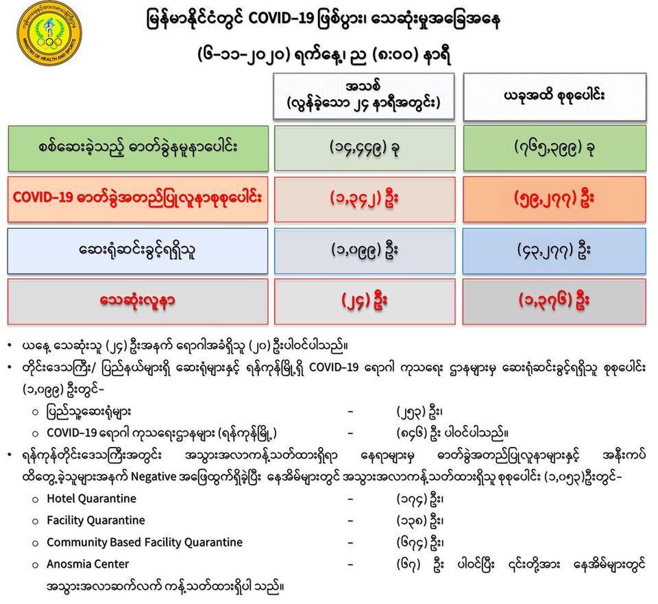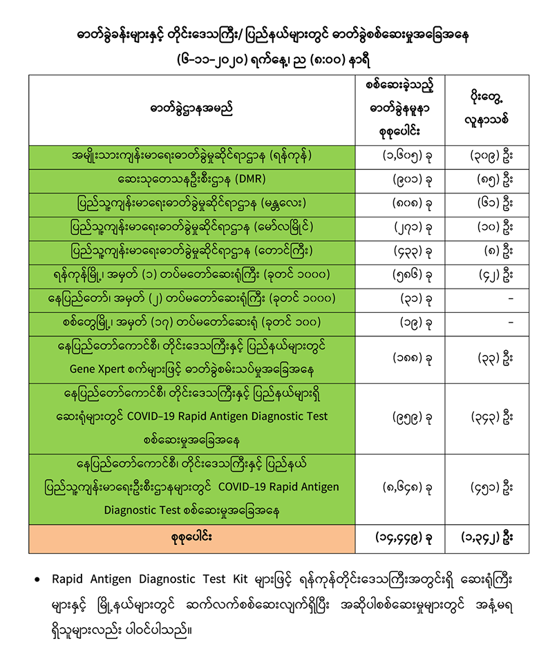 (၅-၁၁-၂၀၂၀) ရက်နေ့၊ ည (၈:၀၀) နာရီမှ (၆-၁၁-၂၀၂၀) ရက်နေ့၊ ည (၈:၀၀) နာရီ အတွင်း ဓာတ်ခွဲနမူနာ စုစုပေါင်း (၁၄,၄၄၉) ခုအား စစ်ဆေးပြီးစီးခဲ့ရာ COVID-19 ရောဂါ ဓာတ်ခွဲအတည်ပြု လူနာသစ်(၁,၃၄၂)ဦး တွေ့ရှိရပါသည်။