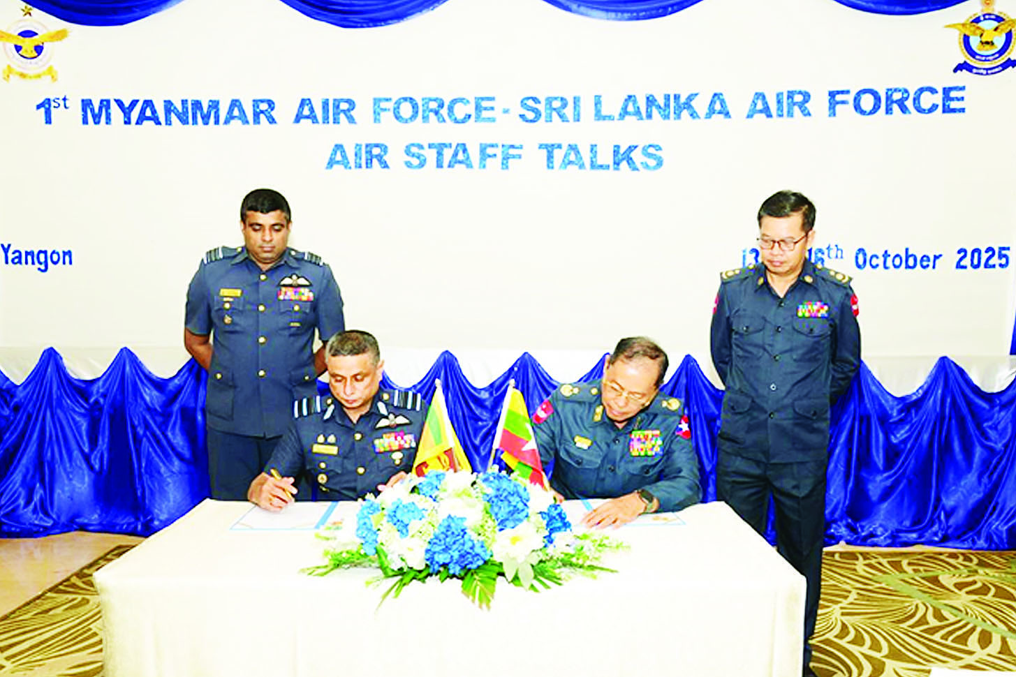 မြန်မာနိုင်ငံက အိမ်ရှင်အဖြစ်ကျင်းပပြုလုပ်သည့် ပထမအကြိမ် မြန်မာ-သီရိလင်္ကာ နှစ်နိုင်ငံ လေတပ် ချင်းတွေ့ဆုံဆွေးနွေးပွဲ (1st Myanmar Air Force– Sri Lanka Air Force Air Staff Talks) ကို အောက်တိုဘာ ၁၄ ရက် နံနက်ပိုင်းတွင် ရန်ကုန်မြို့ရှိ Chatrium Hotel ၌ပြုလုပ်ရာ တပ်မတော်(လေ)မှ ဒုတိယစစ်ဦးစီးအရာရှိချုပ်(လေ)(စက်မှုလက်မှု) ဗိုလ်ချုပ်မျိုးအောင်လတ် ဦးဆောင်သော ကိုယ်စားလှယ်အဖွဲ့ဝင်များ၊ သီရိလင်္ကာလေတပ်မှ Air Vice Marshal SDGM Silva ဦးဆောင်သော ကိုယ်စားလှယ်အဖွဲ့ဝင်များနှင့်တာဝန်ရှိသူများ တက်ရောက်ခဲ့ကြသည်။