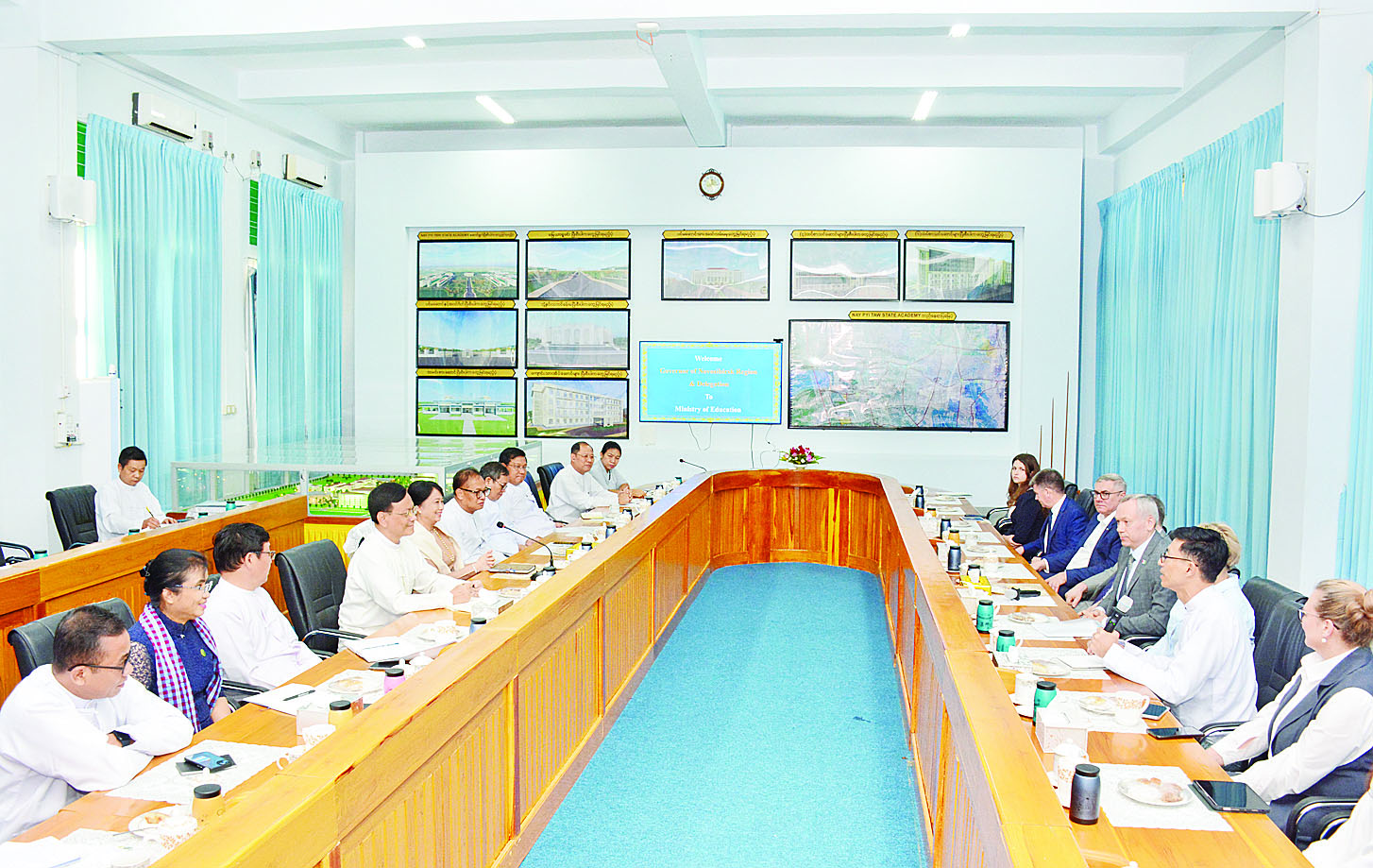 ယင်းနောက် ဧည့်သည်တော်အဖွဲ့သည် ပညာရေးဝန်ကြီးဌာန ပြည်ထောင်စုဝန်ကြီး ဒေါက်တာချောချောစိန်နှင့် Naypyitaw State Academy ရှိ အစည်းအဝေးခန်းမ၌ တွေ့ဆုံသည်။