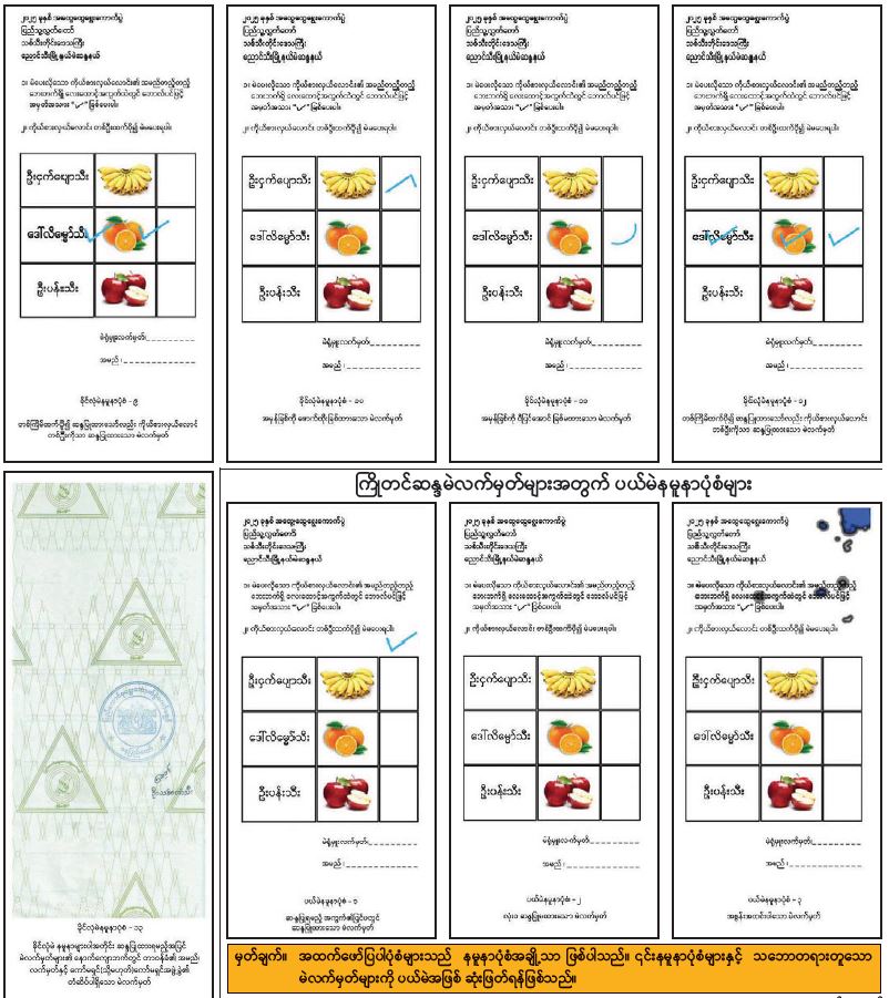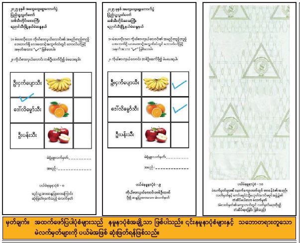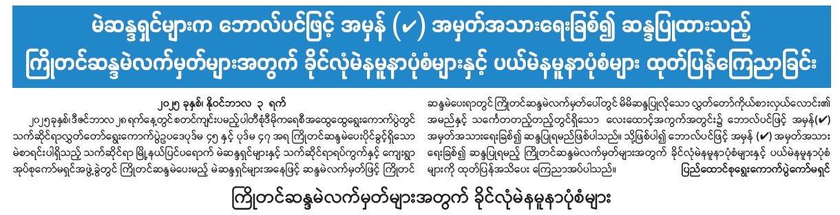 မဲဆန္ဒရှင်များက ဘောလ်ပင်ဖြင့် အမှန်အမှတ်အသားရေးခြစ်၍ ဆန္ဒပြုထားသည့် ကြိုတင်ဆန္ဒမဲ လက်မှတ်များ အတွက်ခိုင်လုံမဲနမူနာပုံစံများနှင့် ပယ်မဲနမူနာပုံစံများထုတ်ပြန်ကြေညာခြင်း