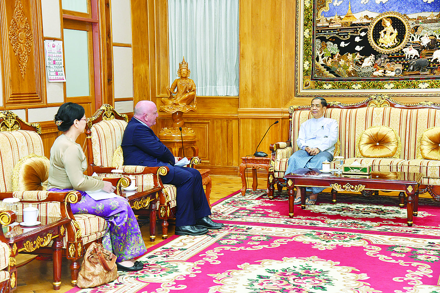 နိုင်ငံတော်သမ္မတရုံးဝန်ကြီးဌာန(၂) ပြည်ထောင်စုဝန်ကြီး ဦးကိုကိုလှိုင်သည် ရန်ကုန်မြို့အခြေစိုက် ကုလသမဂ္ဂလူသားချင်းစာနာထောက်ထားမှုဆိုင်ရာညှိနှိုင်းရေးရုံး(UNOCHA)၏ အကြီးအကဲ Mr. Justin Brady အား ယနေ့မွန်းလွဲပိုင်းတွင် နေပြည်တော်ရှိ အမျိုးသားကာကွယ်ရေးနှင့်လုံခြုံရေးကောင်စီရုံး ဧည့်ခန်းမ၌ လက်ခံတွေ့ဆုံသည်။