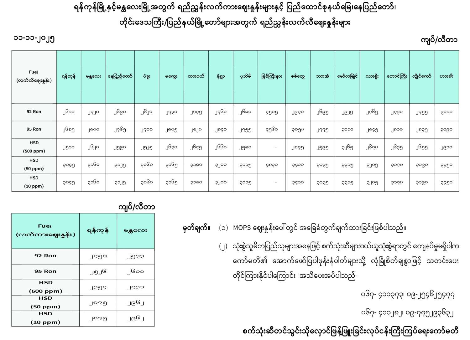 ရန်ကုန်မြို့နှင့် မန္တလေးမြို့အတွက် ရည်ညွှန်းလက်ကားဈေးနှုန်းများနှင့် ပြည်ထောင်စုနယ်မြေ နေပြည်တော်၊ တိုင်းဒေသကြီး/ပြည်နယ် မြို့တော်များအတွက် ရည်ညွှန်းလက်လီဈေးနှုန်းများ 11/11/2025