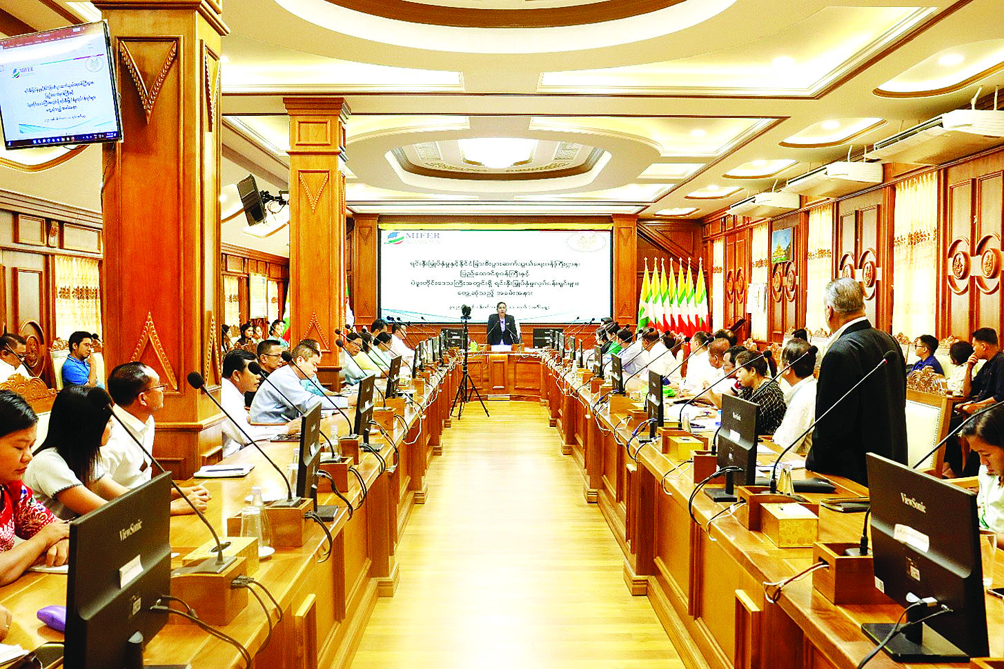 ယင်းနောက် တက်ရောက်လာကြသော စီးပွားရေးလုပ်ငန်းရှင်များက သိရှိလိုသည်များကို မေးမြန်းဆွေးနွေးကြရာ ပြည်ထောင်စုဝန်ကြီးနှင့် တာဝန်ရှိသူများက ပြန်လည်ရှင်းလင်းဖြေကြားသည်။
