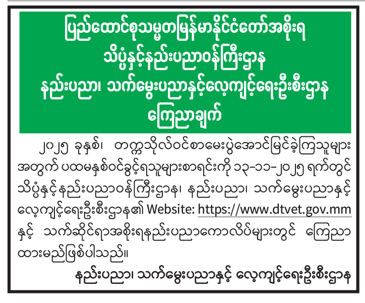 ပြည်ထောင်စုသမ္မတမြန်မာနိုင်ငံတော်အစိုးရ သိပ္ပံနှင့်နည်းပညာဝန်ကြီးဌာန နည်းပညာ၊ သက်မွေးပညာနှင့်လေ့ကျင့်ရေးဦးစီးဌာန ကြေညာချက်