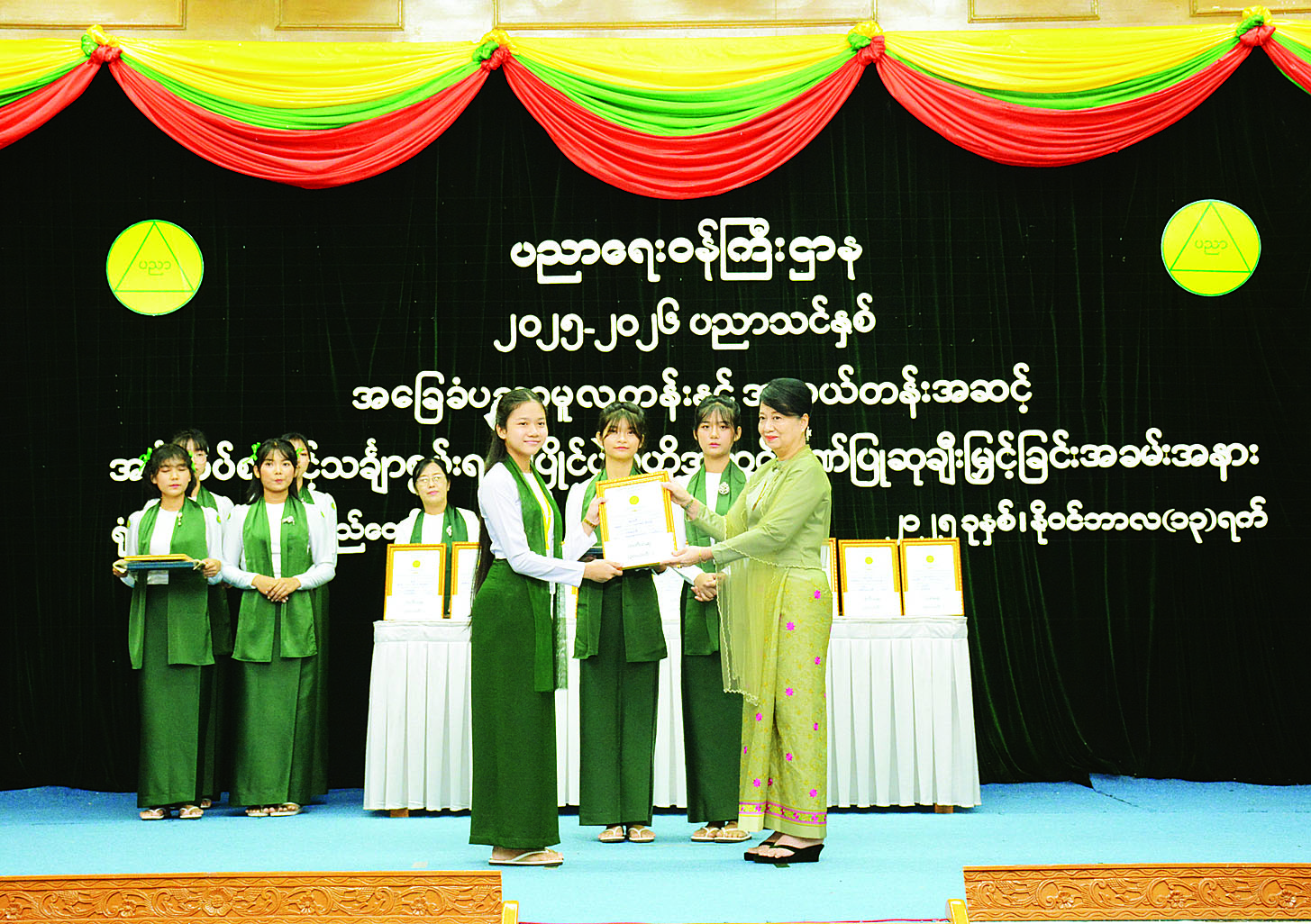 ယင်းနောက် ပြည်ထောင်စုဝန်ကြီးက အကဲဖြတ်စစ်ဆေးခြင်းဆိုင်ရာ လုပ်ငန်းများဆောင်ရွက်ပေးသော တက္ကသိုလ်များနှင့် ပညာရေးဒီဂရီကောလိပ်များမှ အကဲဖြတ်ဒိုင်များကိုယ်စား အင်္ဂလိပ်စာနှင့် သင်္ချာအကဲဖြတ်ဒိုင်ချုပ်နှစ်ဦးကို ဂုဏ်ပြုမှတ်တမ်းလွှာများ ပေးအပ်သည်။