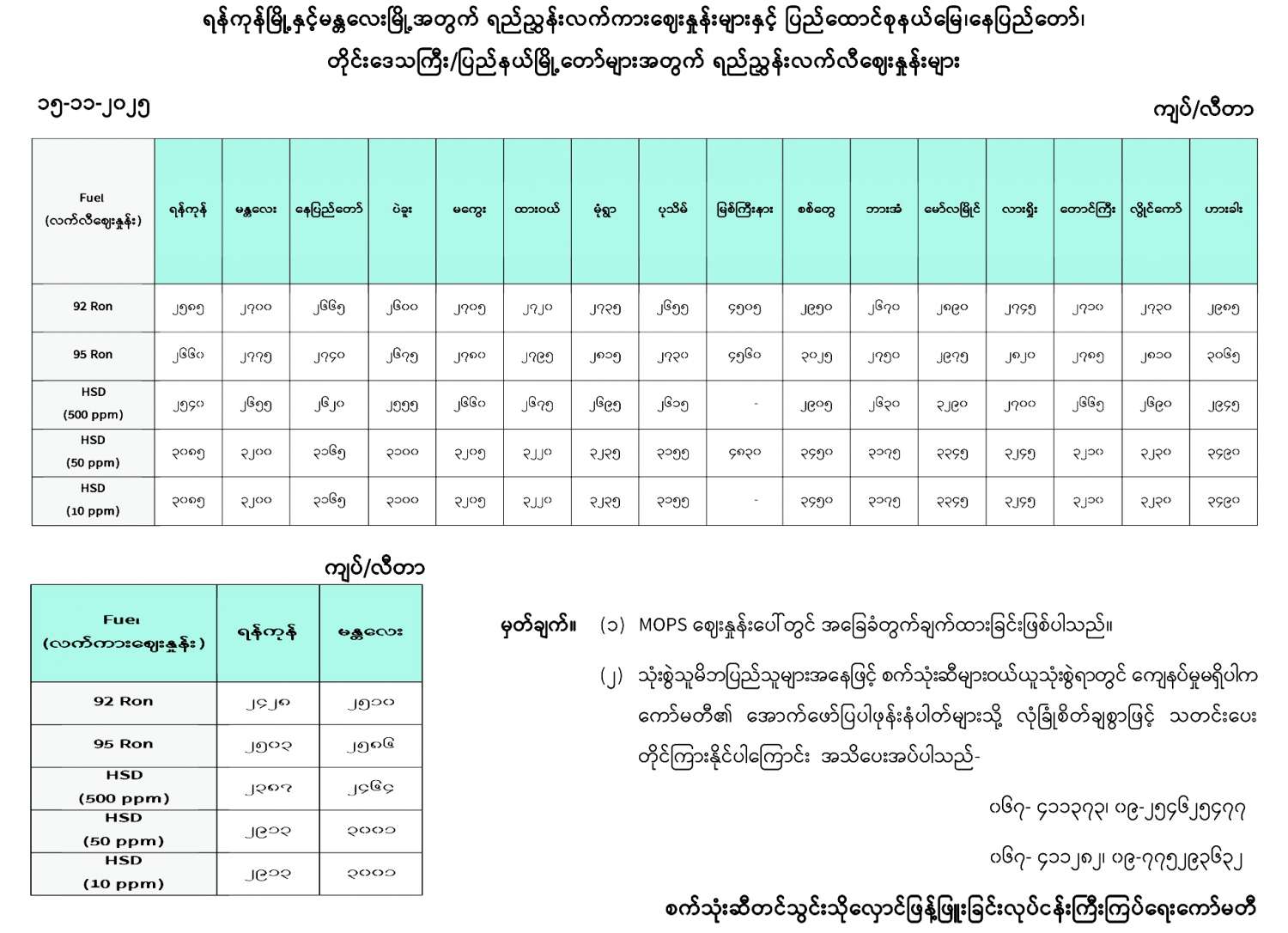 ရန်ကုန်မြို့နှင့် မန္တလေးမြို့အတွက် ရည်ညွှန်းလက်ကားဈေးနှုန်းများနှင့် ပြည်ထောင်စုနယ်မြေ နေပြည်တော်၊ တိုင်းဒေသကြီး/ပြည်နယ် မြို့တော်များအတွက် ရည်ညွှန်းလက်လီဈေးနှုန်းများ 11/15/2025