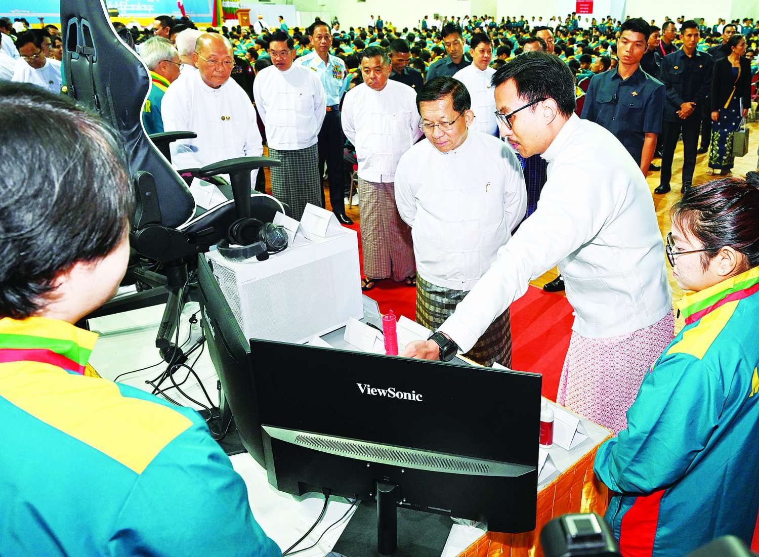 ထိုင်းနိုင်ငံတွင် ကျင်းပပြုလုပ်မည့် (၃၃)ကြိမ်မြောက် အရှေ့တောင်အာရှအားကစားပြိုင်ပွဲသို့ ဝင်ရောက်ယှဉ်ပြိုင်မည့် မြန်မာအားကစားအဖွဲ့အား အောင်နိုင်ရေးအလံအပ်နှင်းပွဲအခမ်းအနားကို ယနေ့နံနက်ပိုင်းတွင် နေပြည်တော်ရှိ ဝဏ္ဏသိဒ္ဓိအားကစားရုံ(A)၌ ကျင်းပရာ နိုင်ငံတော်ယာယီသမ္မတ နိုင်ငံတော်လုံခြုံရေးနှင့် အေးချမ်းသာယာရေးကော်မရှင် ဥက္ကဋ္ဌ ဗိုလ်ချုပ်မှူးကြီး မင်းအောင်လှိုင် တက်ရောက်အမှာစကားပြောကြားပြီး အောင်လံရေးအလံကို အပ်နှင်းသည်။