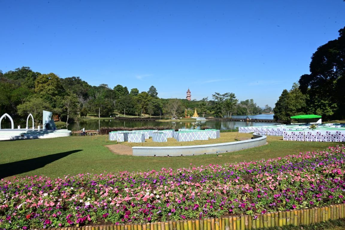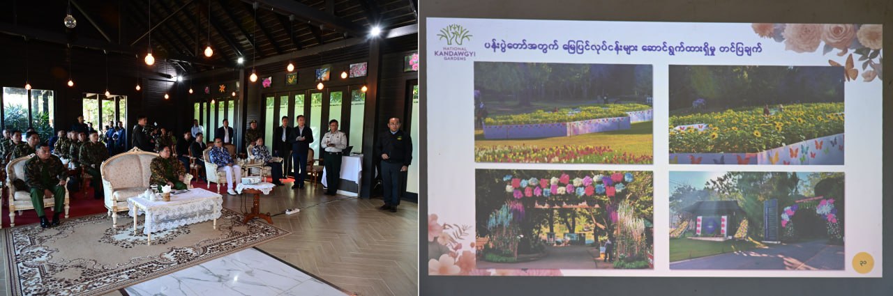 ဦးစွာ နိုင်ငံတော်ယာယီသမ္မတ နိုင်ငံတော်လုံခြုံရေးနှင့် အေးချမ်းသာယာရေးကော်မရှင်ဥက္ကဋ္ဌအား ကန်တော်ကြီးဥယျာဉ်ရှင်းလင်းဆောင်ခန်းမ၌ သယံဇာတနှင့် သဘာဝပတ်ဝန်းကျင်ထိန်းသိမ်းရေးဝန်ကြီးဌာန၊ သစ်တောဦးစီးဌာန ညွှန်ကြားရေးမှူးချုပ် ဒေါက်တာသောင်းနိုင်ဦးနှင့် ဥယျာဉ်တာဝန်ခံကုမ္ပဏီမှ အမှုဆောင်အရာရှိချုပ် ဦးရာဇာထွေးတို့က ၂၀၂၅ ခုနှစ်၊ အောက်တိုဘာလ ၃ ရက်နေ့၌ နိုင်ငံတော်လုံခြုံရေးနှင့် အေးချမ်းသာယာရေးကော်မရှင်ဥက္ကဋ္ဌ တပ်မတော်ကာကွယ်ရေးဦးစီးချုပ် ကန်တော်ကြီးဥယျာဉ်သို့ လာရောက်စစ်ဆေးစဉ် လမ်းညွှန်မှာကြားချက်များအား လိုက်နာဆောင်ရွက်ထားရှိမှုအခြေအနေများ၊ အမျိုးသားကန်တော်ကြီးဥယျာဉ်(၁၈)ကြိမ် မြောက်ပန်းပွဲတော်အား စည်ကားသိုက်မြိုက်စွာဖြင့် ကျင်းပပြုလုပ်နိုင်ရန် ပြင်ဆင်ဆောင်ရွက်ထားရှိမှုအခြေအနေများ၊ ပြကွက်များအလိုက် အလှပန်းမန်များ စိုက်ပျိုးထားရှိမှုအခြေအနေများ၊ လာရောက်အပန်းဖြေအနားယူကြမည့်သူများအတွက် ဂီတဖျော်ဖြေပွဲများ ထည့်သွင်းဆောင်ရွက်သွားမည့်အခြေအနေများကို ရှင်းလင်းတင်ပြပြီး ပန်းပွဲတော်တေးသီချင်း စီစဉ်ရိုက်ကူးထားရှိမှုအား တင်ပြသည်။