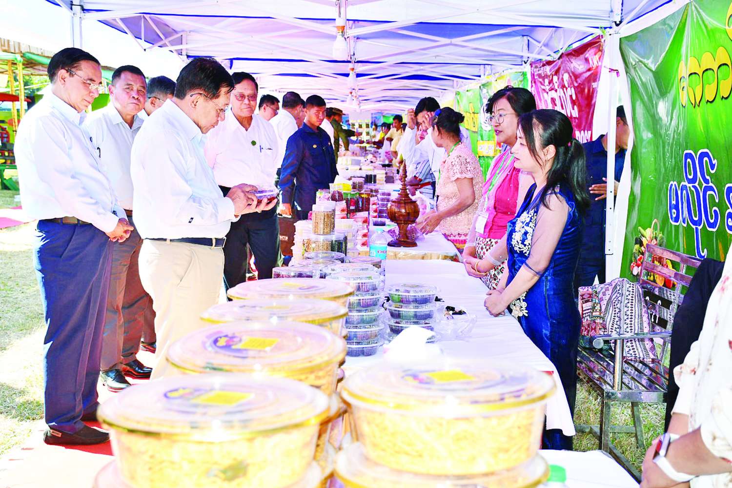 ထို့နောက် နိုင်ငံတော်ယာယီသမ္မတ နိုင်ငံတော်လုံခြုံရေးနှင့်အေးချမ်းသာယာရေးကော်မရှင်ဥက္ကဋ္ဌသည် ခင်းကျင်းပြသထားသည့် ပြည်ခရိုင်အတွင်းရှိ အသေးစား၊ အငယ်စားနှင့် အလတ်စားစီးပွားရေး (MSME) လုပ်ငန်းများမှထွက်ရှိသည့် ထုတ်ကုန်ပစ္စည်းများ၊ လယ်ယာသုံးထုတ်ကုန်ပစ္စည်းများအား လှည့်လည်ကြည့်ရှုပြီး တာဝန်ရှိသူများ၏ တင်ပြချက်များအပေါ်လိုအပ်သည်များ လမ်းညွှန်မှာကြားခဲ့သည်။