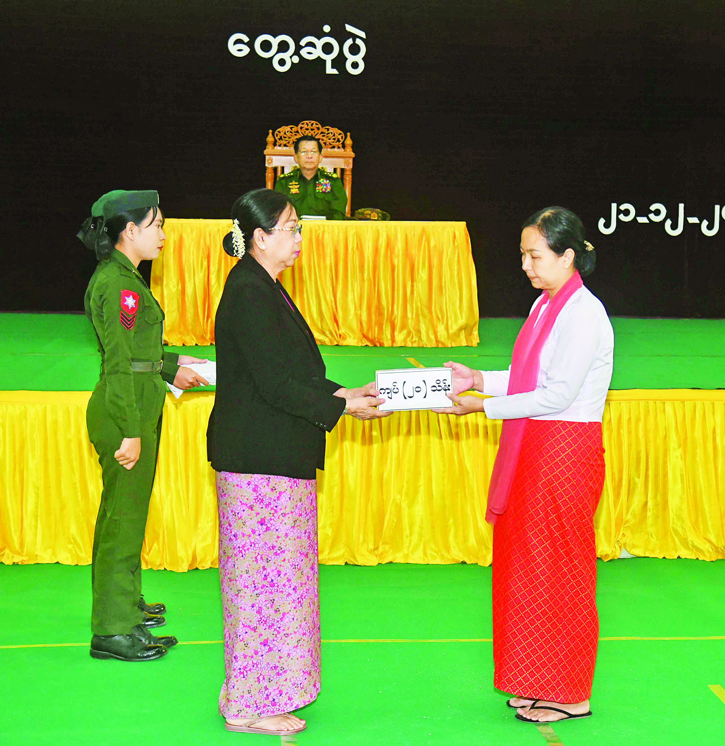 ထို့နောက် နိုင်ငံတော်လုံခြုံရေးနှင့်အေးချမ်းသာယာရေးကော်မရှင်ဥက္ကဋ္ဌ တပ်မတော်ကာကွယ်ရေးဦးစီးချုပ်က တပ်နယ်မှ အရာရှိ၊ စစ်သည်၊ မိသားစုများအတွက် စားသောက်ဖွယ်ရာပစ္စည်းများကိုပေးအပ်ရာ တပ်နယ်မှူးကလည်းကောင်း၊ နိုင်ငံတော်လုံခြုံရေးနှင့်အေးချမ်းသာယာရေးကော်မရှင်ဥက္ကဋ္ဌ တပ်မတော်ကာကွယ်ရေးဦးစီးချုပ်၏ဇနီးက တပ်နယ်မိခင်နှင့်ကလေးစောင့်ရှောက်ရေးအသင်းအတွက် ချီးမြှင့်ငွေများကိုပေးအပ်ရာ တပ်နယ်မှူး၏ ဇနီးကလည်းကောင်း အသီးသီးလက်ခံရယူကြသည်။