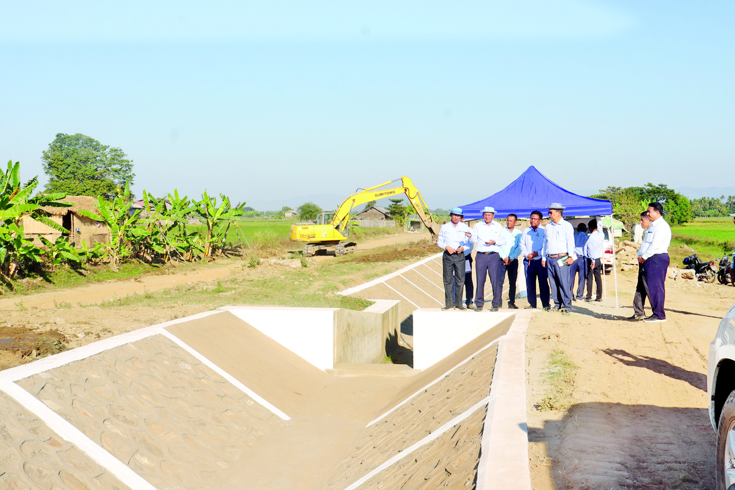 ကြည့်ရှုစစ်ဆေးစဉ် ဆည်မြောင်းနှင့်ရေအသုံးချမှုစီမံခန့်ခွဲရေးဦးစီးဌာန တာဝန်ရှိသူများက ချောင်းမငယ် ရေလှောင်တမံနှင့် မဒန်းရေလှောင်တမံတို့၏ လက်ရှိ ရေလှောင်ပမာဏနှင့် အသုံးပြုနိုင်မှုအခြေအနေများ၊ အင်အားပြင်း ငလျင်လှုပ်ခတ်ခဲ့ပြီးနောက် ဆည်ရေသောက်စနစ်များ ထိခိုက်ပျက်စီးခဲ့မှုများကို အရေးပေါ်ပြင်ဆင်ခြင်းလုပ်ငန်းများ ဦးစားပေးအပိုင်းလိုက် ဆောင်ရွက်ပြီးစီးခဲ့မှု၊ မိုးစပါးနှင့် မိုးသီးနှံအတွက် စိုက်ပျိုးရေပေးဝေခဲ့မှု၊ ဆောင်းသီးနှံလျာထားစိုက်ပျိုးမှု၊ နွေစပါးနှင့် နွေသီးနှံစိုက်ပျိုးရေပေးဝေနိုင်ရေး စီမံဆောင်ရွက်သွားမည့် အခြေအနေများကို ရှင်းလင်းတင်ပြကြရာ ဒုတိယဝန်ကြီးက သတ်မှတ်ဒီဇိုင်းပုံစံများအတိုင်း စံချိန်စံညွှန်းများနှင့်အညီ အရည်အသွေးပြည့်မီစွာဆောင်ရွက်ရေး၊ နွေစပါးနှင့် နွေသီးနှံ စိုက်ပျိုးရေပေးဝေချိန်အမီ လုပ်ငန်းများပြီးစီးရေး၊ စိုက်ပျိုးရေပေးဝေချိန်၌ ထပ်မံပျက်စီးမှု မဖြစ်ပေါ်စေရေးအတွက် ဦးစားပေးထိန်းသိမ်းရမည့်အပိုင်းများကို လိုအပ်သလို ကြိုတင်ကာကွယ်ဆောင်ရွက်ရန်နှင့် အခြားနည်းပညာပိုင်းဆိုင်ရာ လိုအပ်သည်များကို ဖြည့်စွက်မှာကြားပြီး ဆည်ရေသောက်စနစ်အတွင်း ထိခိုက်ပျက်စီးခဲ့သော တူးမြောင်းများနှင့် တူးမြောင်းအဆောက်အအုံများကို စက်ယန္တရားအင်အား၊ လူအင်အားတို့ဖြင့် ပြုပြင်ဆောင်ရွက်နေမှု၊ ဆောင်းသီးနှံစိုက်ပျိုးထားရှိမှုတို့ကို ကြည့်ရှုစစ်ဆေးသည်။