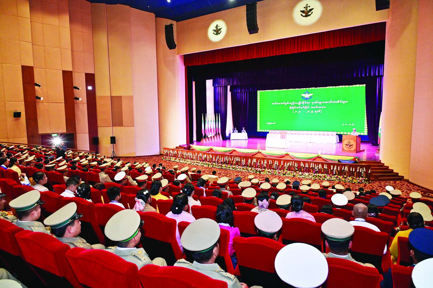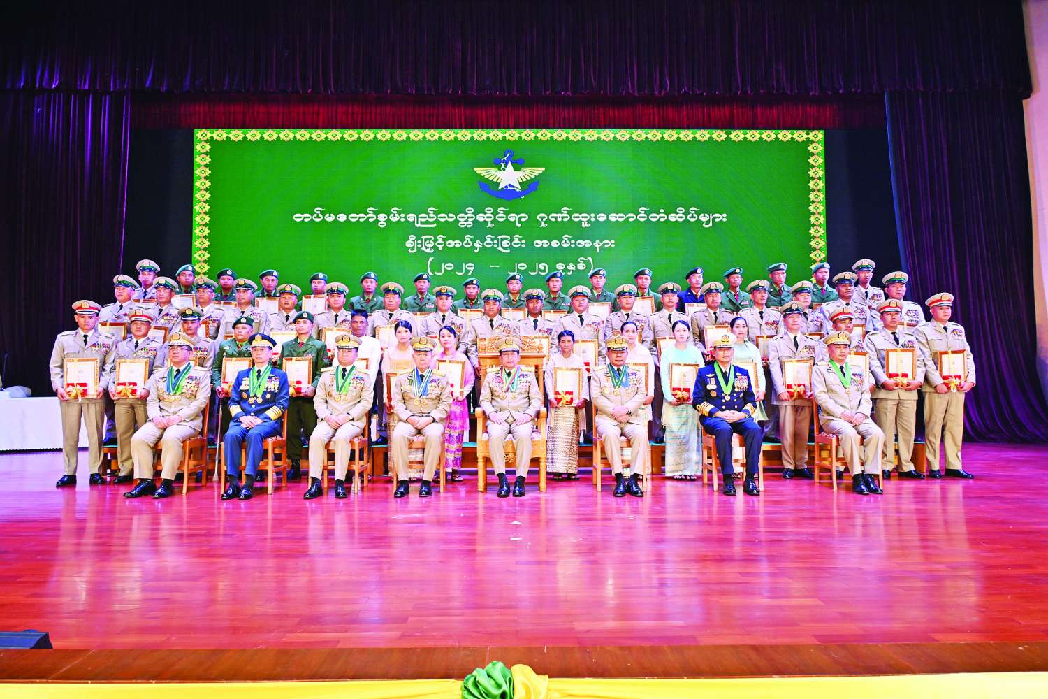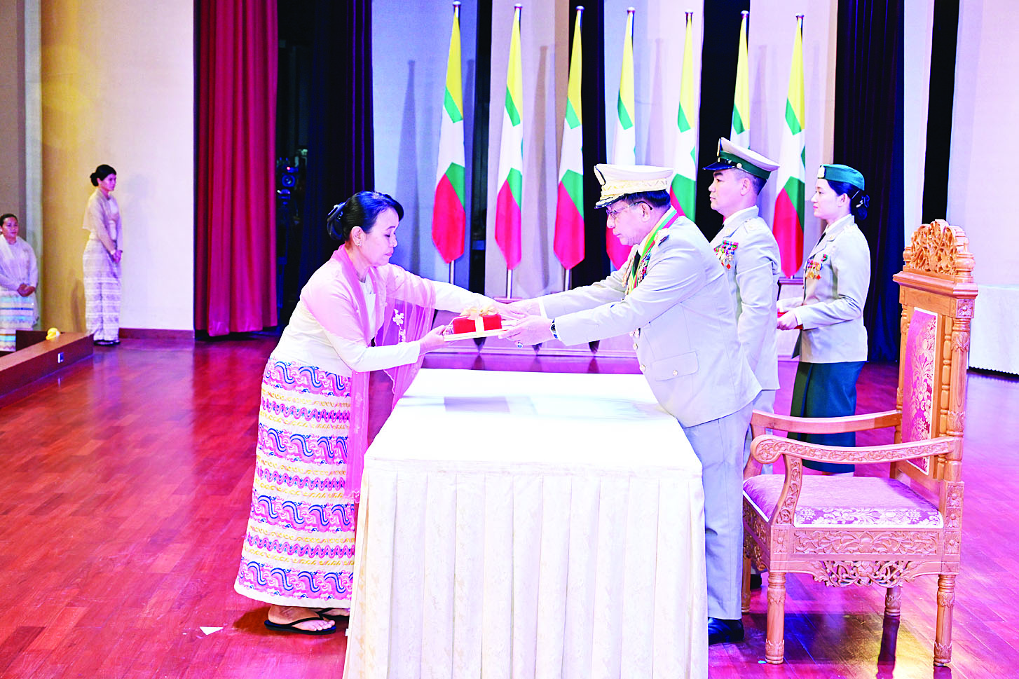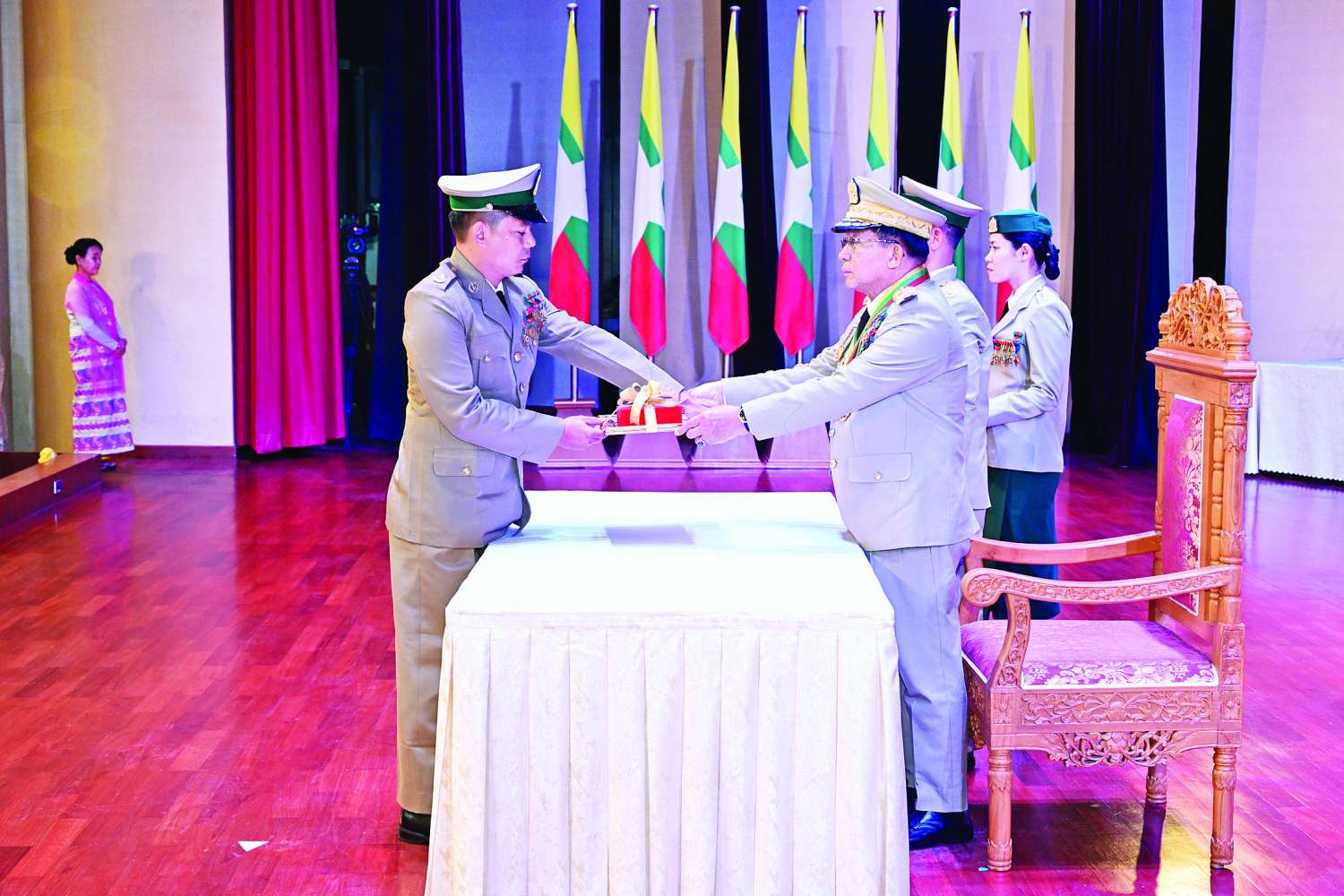 နိုင်ငံတော်လုံခြုံရေးနှင့်အေးချမ်းသာယာရေးကော်မရှင်ဥက္ကဋ္ဌ တပ်မတော်ကာကွယ်ရေးဦးစီးချုပ် ဗိုလ်ချုပ်မှူးကြီး သတိုးမဟာသရေစည်သူ သတိုးသီရိသုဓမ္မ မင်းအောင်လှိုင် တပ်မတော်စွမ်းရည်သတ္တိဆိုင်ရာ ဂုဏ်ထူးဆောင်တံဆိပ်ချီးမြှင့်အပ်နှင်းခြင်း အခမ်းအနားသို့ တက်ရောက်ဂုဏ်ပြု