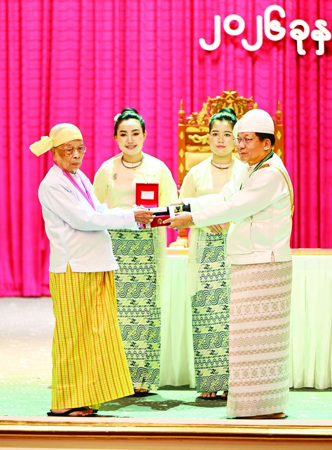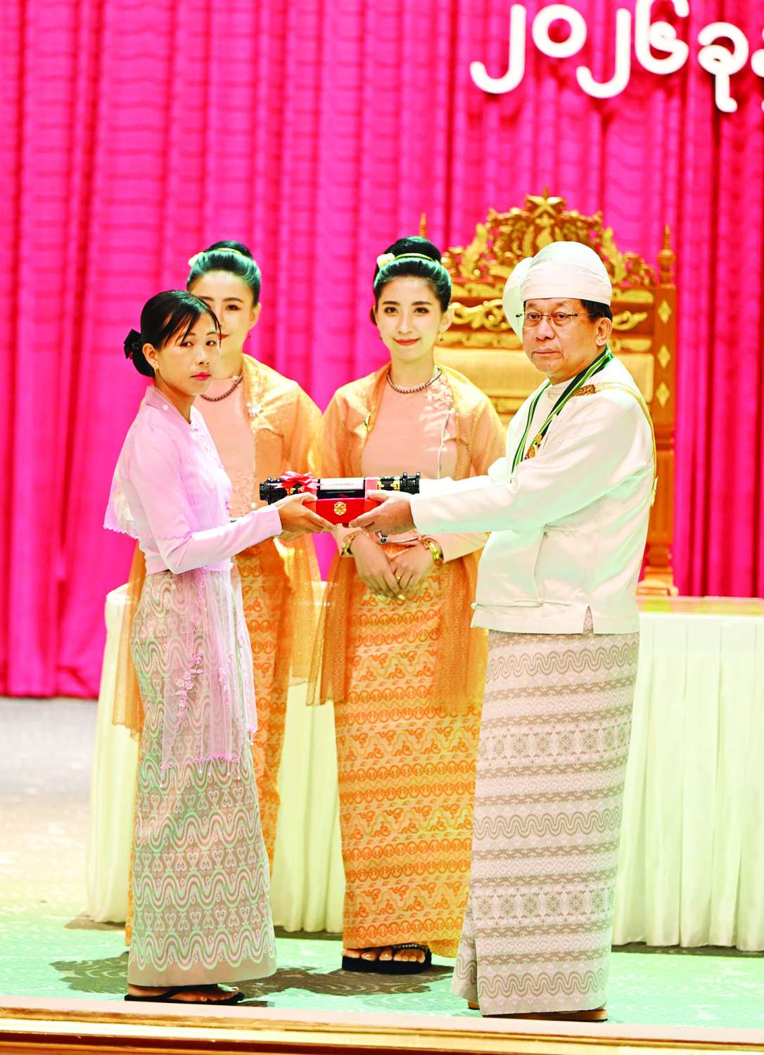ထို့နောက် နိုင်ငံတော်ယာယီသမ္မတ နိုင်ငံတော်လုံခြုံရေးနှင့်အေးချမ်းသာယာရေး ကော်မရှင်ဥက္ကဋ္ဌ ဗိုလ်ချုပ်မှူးကြီး သတိုးမဟာသရေစည်သူ သတိုးသီရိသုဓမ္မ မင်းအောင်လှိုင်က ပြည်ထောင်စုစည်သူသင်္ဂဟဘွဲ့များဖြစ်ကြသည့် စည်သူဘွဲ့ ၁၃ ဦး၊ တပ်မတော်စွမ်းရည်သတ္တိဘွဲ့များဖြစ်ကြသည့် သီဟသူရဘွဲ့ရရှိသူ ၂ ဦးနှင့် သူရဘွဲ့ရရှိသူ ၁ ဦး၊ သီရိပျံချီ ဘွဲ့ ၁၀ ဦး၊ ဇေယျကျော်ထင်ဘွဲ့ ၉ ဦး၊ ဝဏ္ဏကျော်ထင်ဘွဲ့ ၁၇ ဦး၊ အလင်္ကာကျော်စွာဘွဲ့ ၈ ဦး၊ သိပ္ပကျော်စွာဘွဲ့ ၁၁ ဦးတို့ကို ဂုဏ်ထူးဆောင်ဘွဲ့များ တစ်ဦးချင်းလက်ရောက်ချီးမြှင့် အပ်နှင်းသည်။