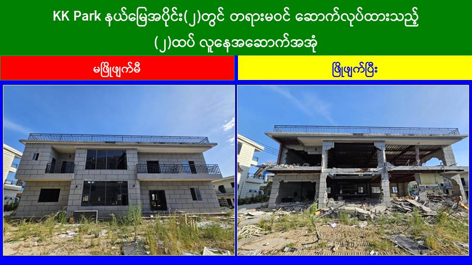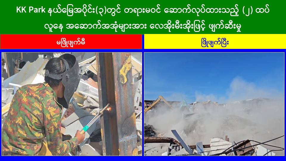 မြန်မာနိုင်ငံအစိုးရအနေဖြင့် အွန်လိုင်းလိမ်လည်လောင်းကစားမှုများ အများဆုံး အခြေချလုပ်ကိုင်လျက်ရှိကြသည့် ရွှေကုက္ကိုလ်နယ်မြေနှင့် KK Park နယ်မြေများရှိတရားမဝင် အဆောက်အအုံများအတွင်း ဝင်ရောက်ရှင်းလင်း၍ အွန်လိုင်းလိမ်လည် လောင်းကစားမှုလုပ်ငန်းစဉ်များတွင် အသုံးပြုခဲ့သည့် သိမ်းဆည်းရမိပစ္စည်းများအား စနစ်တကျဖျက်ဆီးခြင်းနှင့် တရားမဝင်အဆောက်အအုံများအား စနစ်တကျဖြိုချ ဖျက်ဆီးခြင်းများကို အဖွဲ့စုံပါဝင်သည့်ပူးပေါင်းအဖွဲ့ဖြင့် ဆောင်ရွက်လျက်ရှိရာ ယနေ့တွင်လည်း KK Park နယ်မြေအတွင်းရှိ တရားမဝင်အဆောက်အအုံ ၂၁ လုံးကို ထပ်မံဖြိုချဖျက်ဆီးခဲ့ကြောင်း သိရှိရသည်။