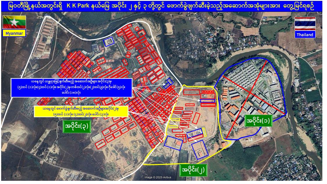 ယနေ့တွင် မြဝတီ-မဲထော်သလေး(KK Park) အပိုင်း(၃)နယ်မြေအတွင်းရှိ အွန်လိုင်းလိမ်လည်လောင်းကစားမှုများ ကျူးလွန်ရာတွင် အသုံးပြုခဲ့သည့် တရားမဝင် ၄ ထပ်အဆောက်အအုံ ၁ လုံး၊ ၅ ထပ်အဆောက်အအုံ ၁ လုံးနှင့် အပိုင်း(၂)နယ်မြေအတွင်းရှိ အွန်လိုင်းလိမ်လည်လောင်းကစားမှုများ ကျူးလွန်ရာတွင် အသုံးပြုခဲ့သည့် တရားမဝင် ၁ ထပ် အဆောက်အအုံ ၇ လုံး၊ ၂ ထပ်အဆောက်အအုံ ၁၀ လုံး၊ ၄ ထပ်အဆောက်အအုံ ၂ လုံး၊ စုစုပေါင်း တရားမဝင်အဆောက်အအုံ ၂၁ လုံးတို့ကို ထပ်မံဖြိုချဖျက်ဆီးခဲ့သဖြင့် KK Park နယ်မြေအတွင်းရှိ တရားမဝင်အဆောက်အအုံ စုစုပေါင်း ၆၃၅ လုံး အနက် ၆၃၁ လုံးကို စနစ်တကျ ဖြိုချဖျက်ဆီးပြီးဖြစ်ကြောင်း သိရှိရသည်။