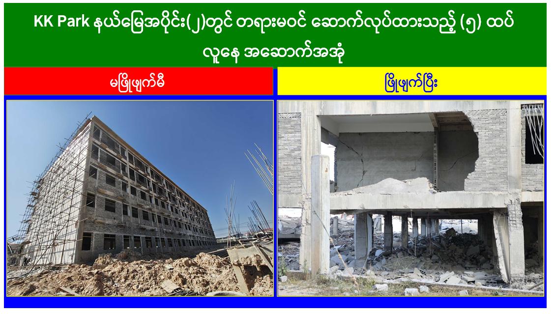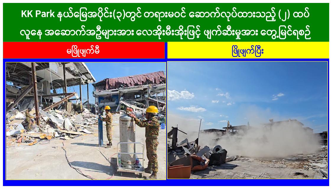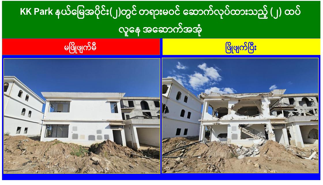 မြန်မာနိုင်ငံအစိုးရအနေဖြင့် အွန်လိုင်းလိမ်လည်လောင်းကစားမှုများ အများဆုံးအခြေချလုပ်ကိုင်လျက်ရှိကြသည့် ရွှေကုက္ကိုလ်နယ်မြေနှင့် KK Park နယ်မြေများရှိတရားမဝင် အဆောက်အအုံများအတွင်း ဝင်ရောက်ရှင်းလင်း၍ အွန်လိုင်းလိမ်လည် လောင်းကစားမှုလုပ်ငန်းစဉ်များတွင် အသုံးပြုခဲ့သည့် သိမ်းဆည်းရမိပစ္စည်းများအား စနစ်တကျဖျက်ဆီးခြင်းနှင့် တရားမဝင်အဆောက်အအုံများအား စနစ်တကျဖြိုချဖျက်ဆီးခြင်းများကို အဖွဲ့စုံပါဝင်သည့် ပူးပေါင်းအဖွဲ့ဖြင့် ဆောင်ရွက်လျက်ရှိရာ ယနေ့တွင်လည်း KK Park နယ်မြေအတွင်းရှိ တရားမဝင်အဆောက်အအုံ ၂၁ လုံးကို ထပ်မံဖြိုချဖျက်ဆီးခဲ့ကြောင်း သိရှိရသည်။