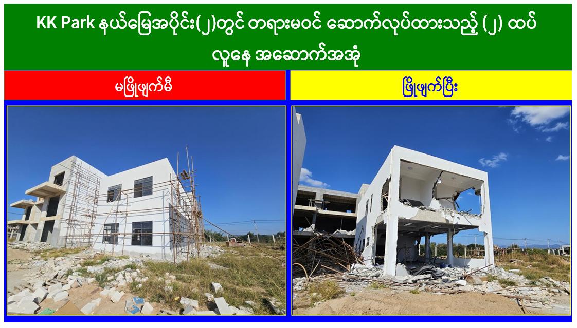 KK Park နယ်မြေအတွင်း အွန်လိုင်းလိမ်လည်လောင်းကစားမှု ကျူးလွန်ရာတွင် အသုံးပြုသည့် တရားမဝင်အဆောက်အအုံ ၆၃၁ လုံး စနစ်တကျဖြိုချဖျက်ဆီးပြီးဖြစ်