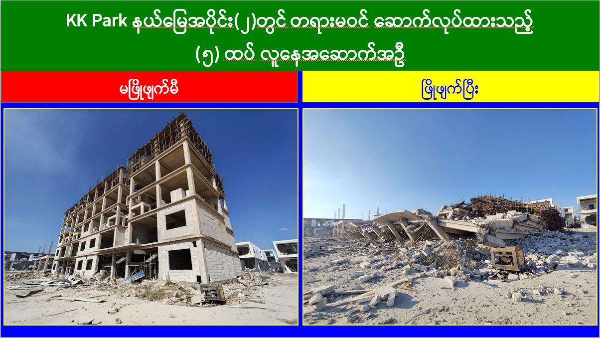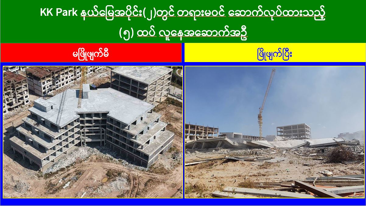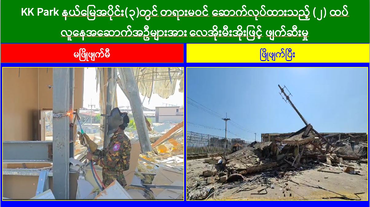 မြန်မာနိုင်ငံအစိုးရအနေဖြင့် အွန်လိုင်းလိမ်လည်လောင်းကစားမှုများ အများဆုံးအခြေချလုပ်ကိုင်လျက်ရှိကြသည့် ရွှေကုက္ကိုလ်နယ်မြေနှင့် KK Park နယ်မြေများရှိ တရားမဝင်အဆောက်အအုံများအတွင်း ဝင်ရောက်ရှင်းလင်း၍ အွန်လိုင်းလိမ်လည်လောင်းကစားမှုလုပ်ငန်းစဉ်များတွင် အသုံးပြုခဲ့သည့် သိမ်းဆည်းရမိပစ္စည်းများအား စနစ်တကျဖျက်ဆီးခြင်းနှင့် တရားမဝင်အဆောက်အအုံများအား စနစ်တကျဖြိုချဖျက်ဆီးခြင်းများကို အဖွဲ့စုံပါဝင်သည့် ပူးပေါင်းအဖွဲ့ဖြင့် ဆောင်ရွက်လျက်ရှိရာ ယနေ့တွင်လည်း KK Park နယ်မြေအတွင်းရှိ တရားမဝင်အဆောက်အအုံ ၂ လုံးကို ထပ်မံဖြိုချဖျက်ဆီးခဲ့ကြောင်း သိရှိရသည်။