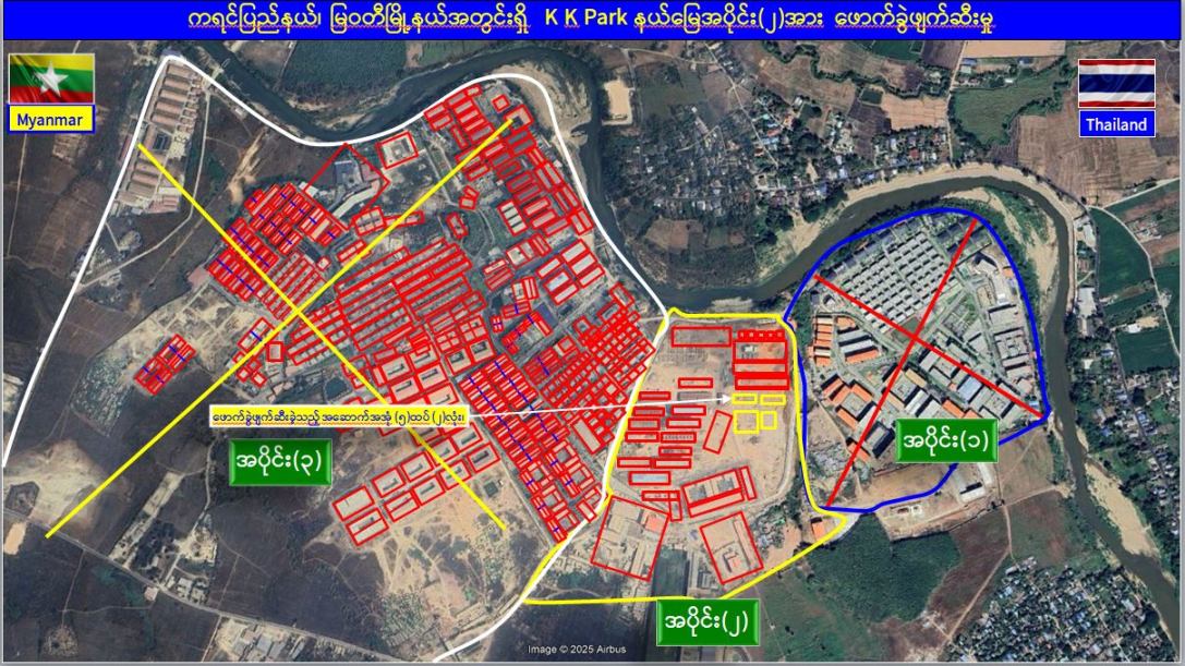 ယနေ့တွင် မြဝတီ-မဲထော်သလေး (KK Park) အပိုင်း(၁)နယ်မြေရှိ အွန်လိုင်းလိမ်လည်လောင်းကစားမှုများကျူးလွန်ရာတွင် အသုံးပြုခဲ့သည့် တရားမဝင်အဆောက်အအုံ ၁၄၈ လုံးနှင့် အပိုင်း(၃)နယ်မြေအတွင်းရှိ တရားမဝင်အဆောက်အအုံ ၄၂၅ လုံးတို့အား ဖြိုချဖျက်ဆီးပြီးဖြစ်ပြီး ယနေ့တွင် အပိုင်း(၂) နယ်မြေအတွင်းရှိအွန်လိုင်းလိမ်လည် လောင်းကစားမှုများကျူးလွန်ရာတွင် အသုံးပြုခဲ့သည့် တရားမဝင် ၅ ထပ်အဆောက်အအုံ ၂ လုံးကို ထပ်မံဖြိုချဖျက်ဆီးခဲ့သဖြင့် KK Park နယ်မြေအတွင်းရှိ တရားမဝင်အဆောက်အအုံ စုစုပေါင်း ၆၃၅ လုံးအနက် ၆၃၃ လုံးကို စနစ်တကျ ဖြိုချဖျက်ဆီးပြီးဖြစ်ကြောင်း သိရှိရသည်။