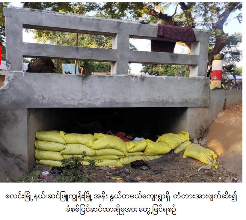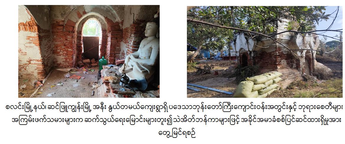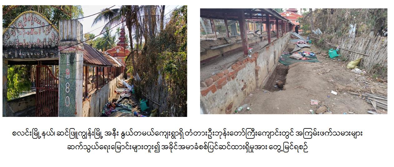 ထို့ပြင် အကြမ်းဖက်သမားများသည် ကျေးရွာရှိဘုရားစေတီပုထိုးများ၊ တံတားဦးဘုန်းတော်ကြီးကျောင်း၊ ပဒေသာဘုန်းတော်ကြီးကျောင်းနှင့် သာသနိကအဆောက်အအုံများ၊ ဌာနဆိုင်ရာအဆောက်အအုံများ၊ ကျေးရွာအခြေခံပညာ အလယ်တန်းကျောင်းခွဲနှင့် ဒေသခံပြည်သူများ၏ နေအိမ်များအတွင်းနှင့် ခြံဝန်းများအတွင်း၌ အခြေပြု၍ ဘန်ကာများ၊ သဲအိတ်များ၊ ကတုတ်ကျင်းများဖြင့် အခိုင်အမာခံစစ်တည်ဆောက်ပြီး ဘုရားစေတီများ၊ သာသနိကအဆောက်အအုံများ၊ တန်ဆောင်းများနှင့် စာသင်ကျောင်းများကို အကာအကွယ်ရယူ၍ ခုခံတိုက်ခိုက်ခြင်း၊ ကျေးရွာတံတားအား ဖောက်ခွဲဖျက်ဆီးပြီး အကာအကွယ်ပြုလုပ်ထားခြင်း၊ ဘုန်းတော်ကြီးကျောင်းဝန်းများနှင့် ကျေးရွာလမ်းများ၌ လက်လုပ်မိုင်းများထောင်ထားခြင်းတို့ လုပ်ဆောင်ထားသည်ကို တွေ့ရှိခဲ့ရကြောင်းနှင့် ကျေးရွာအတွင်း၌ လက်လုပ်မိုင်းအန္တရာယ်ကင်းဝေးစေရေးအတွက် လုံခြုံရေးတပ်ဖွဲ့ဝင်များက မိုင်းရှင်းလင်းရေးလုပ်ငန်းများကို ဆောင်ရွက်ပေးလျက်ရှိကြောင်း သိရှိရသည်။