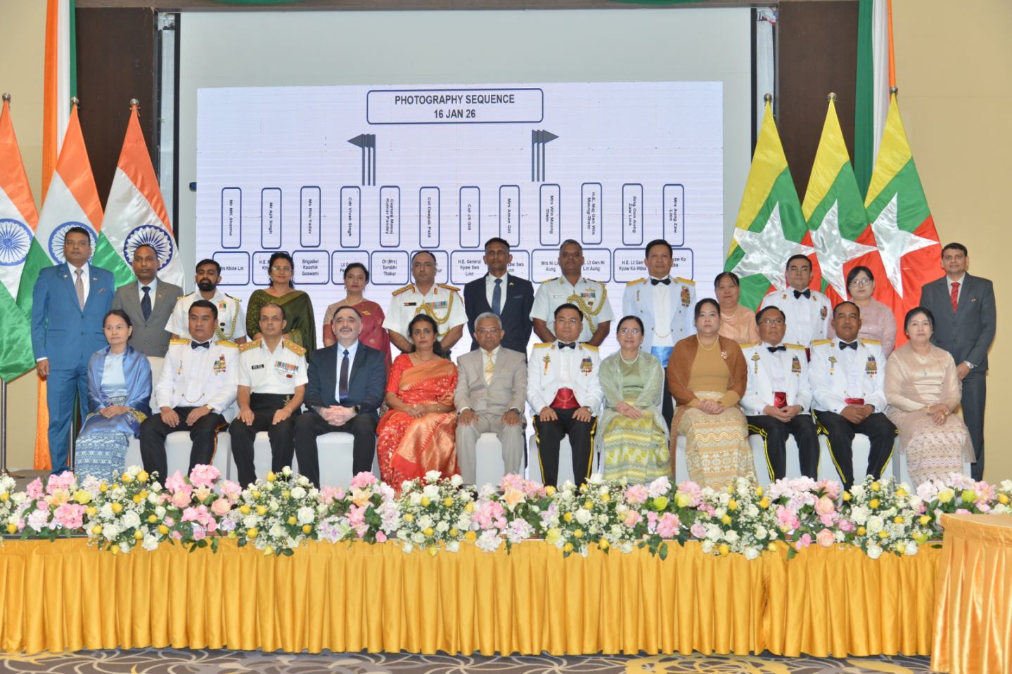 ဦးစွာ နိုင်ငံတော်လုံခြုံရေးနှင့်အေးချမ်းသာယာရေးကော်မရှင်အဖွဲ့ဝင် ညှိနှိုင်းကွပ်ကဲရေးမှူး(ကြည်း၊ ရေ၊ လေ) ဗိုလ်ချုပ်ကြီးကျော်စွာလင်းနှင့်အဖွဲ့ဝင်များသည် အဆိုပါအခမ်းအနား ကျင်းပသည့်နေရာသို့ ရောက်ရှိကြရာ မြန်မာနိုင်ငံဆိုင်ရာ အိန္ဒိယသံအမတ်ကြီး H.E.Mr. Abhay Thakur ၊ အိန္ဒိယတပ်မတော်၊ အမှတ်(၃) တပ်မကြီးမှူး Lieutenant General AS Pendharkar, AVSM, YSM ၊ မြန်မာနိုင်ငံဆိုင်ရာ အိန္ဒိယနိုင်ငံစစ်သံမှူး၊ ရေတပ်စစ်သံမှူးနှင့် ၎င်းတို့၏ဇနီးတို့က ရင်းရင်းနှီးနှီး ကြိုဆိုနှုတ်ဆက်ကြသည်။