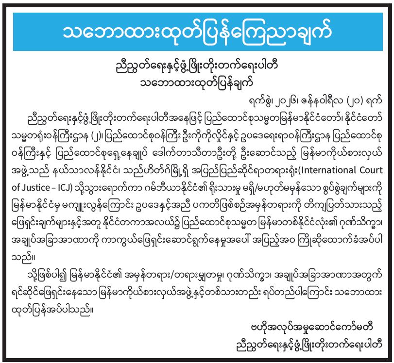 ညီညွတ်ရေးနှင့်ဖွံ့ဖြိုးတိုးတက်ရေးပါတီ သဘောထားထုတ်ပြန်ချက်