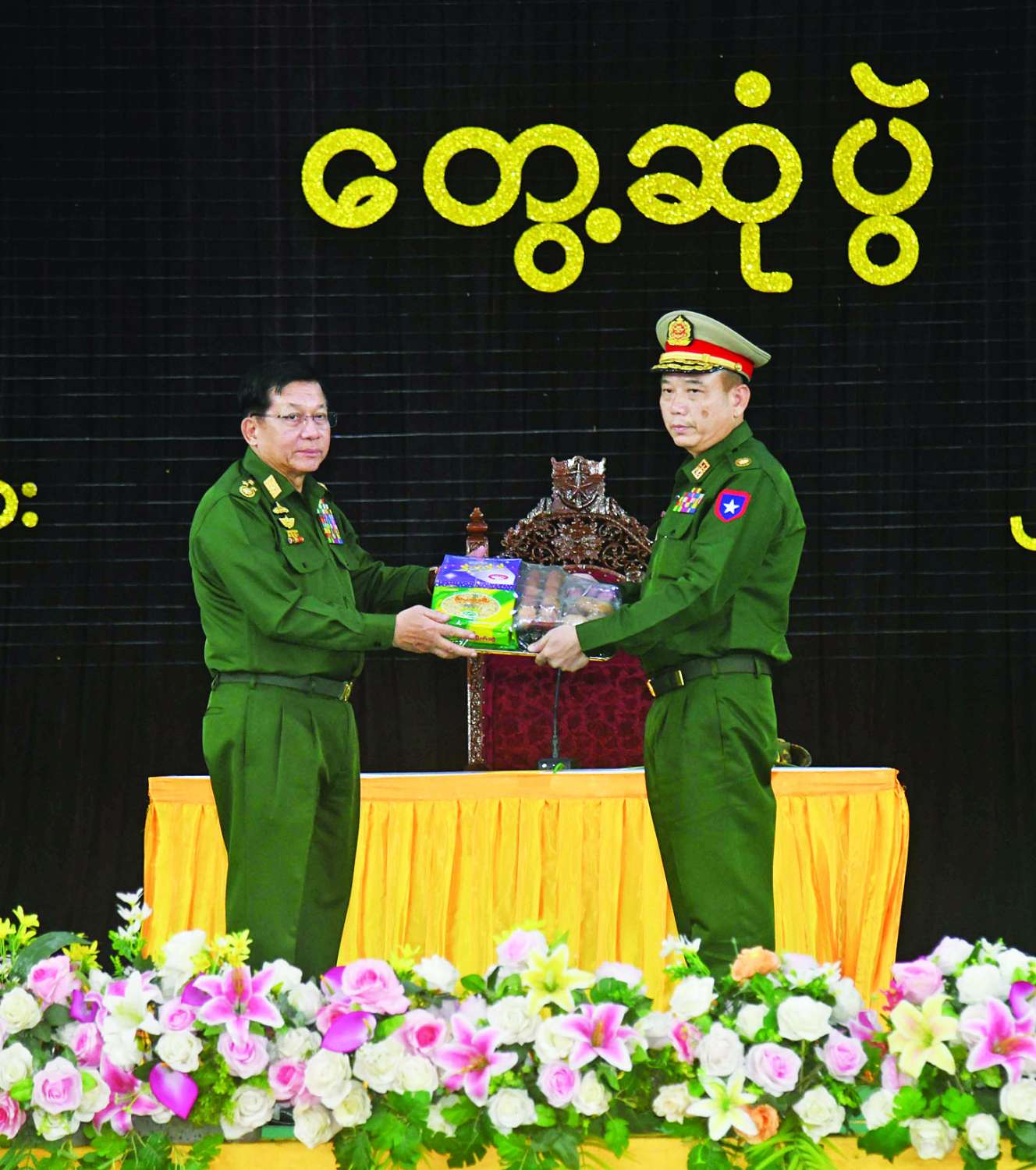 ယင်းနောက် နိုင်ငံတော်လုံခြုံရေးနှင့် အေးချမ်းသာယာရေးကော်မရှင်ဥက္ကဋ္ဌ တပ်မတော်ကာကွယ် ရေးဦးစီးချုပ်က အရာရှိ၊ စစ်သည်၊ မိသားစုများအတွက် စားသောက်ဖွယ်ရာပစ္စည်းများကို ပေးအပ်ရာ တိုင်းမှူးကလည်းကောင်း၊ နိုင်ငံတော်လုံခြုံရေးနှင့် အေးချမ်းသာယာရေးကော်မရှင်ဥက္ကဋ္ဌ တပ်မတော်ကာကွယ်ရေးဦးစီးချုပ်၏ ဇနီးက တပ်နယ်မိခင်နှင့် ကလေးစောင့်ရှောက်ရေးအသင်းအတွက် ချီးမြှင့်ငွေများကို ပေးအပ်ရာ တိုင်းမှူး၏ ဇနီးကလည်းကောင်း အသီးသီးလက်ခံရယူသည်။