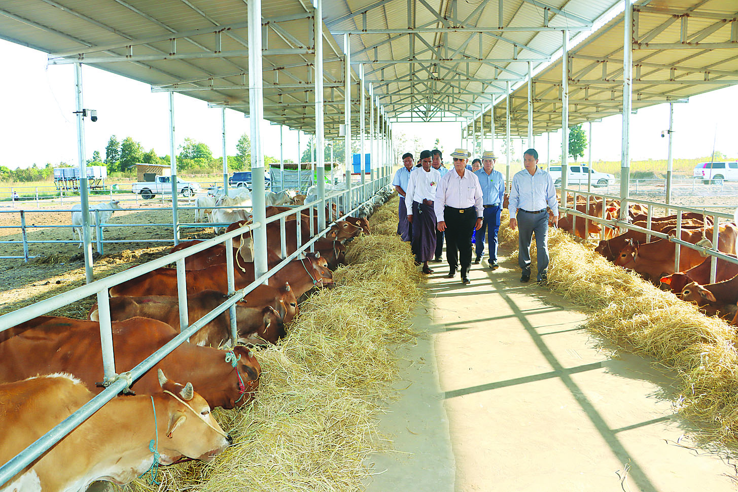 မွန်းလွဲပိုင်းတွင် ပြည်ထောင်စုဝန်ကြီးနှင့် တာဝန်ရှိသူများသည် လယ်ဝေးမြို့နယ် တလုပ်ပင်ကျေးရွာရှိ ဒို့မြန်မာသမဝါယမအသင်းနှင့် ကြံတိုင်းအောင် သမဝါယမအသင်းတို့ အကျိုးတူပူးပေါင်းဆောင်ရွက်လျက်ရှိသည့် စပ်မျိုးနွားကောင်ရေ ၄၇၂ ကောင် မွေးမြူထားရှိမှုကို သွားရောက်ကြည့်ရှုပြီး နွားစာအတွက် ဖြည့်စွက်စာများဖြစ်သည့် ပြောင်း၊ ဟင်းနုနယ်နှင့် နေဗီယာမြက်များ တိုးချဲ့စိုက်ပျိုးရန် ဆွေးနွေးမှာကြားကာ နေဗီယာမြက်စိုက်ပျိုးထားရှိမှု၊ ဝန်ထမ်းအဆောင်နှင့် ရုံးခန်းများ တည်ဆောက်ထားရှိမှုကို လှည့်လည်ကြည့်ရှုသည်။