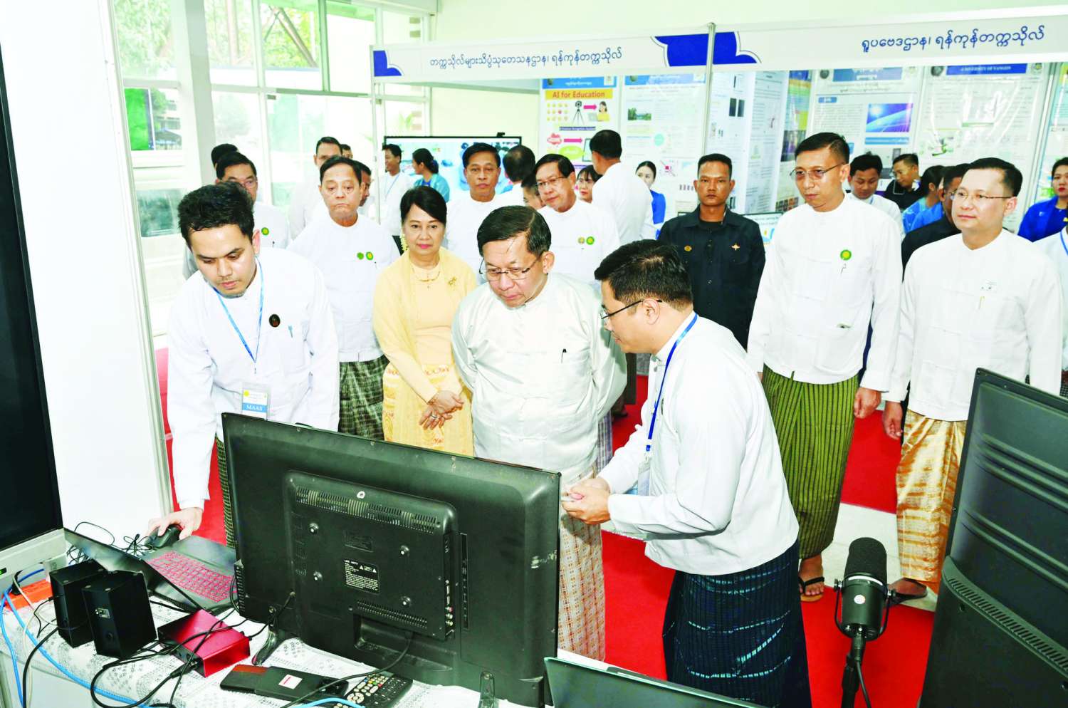ဦးစွာ နိုင်ငံတော်ယာယီသမ္မတ နိုင်ငံတော်လုံခြုံရေးနှင့် အေးချမ်းသာယာရေးကော်မရှင်ဥက္ကဋ္ဌနှင့် အခမ်းအနားတက်ရောက်လာကြသူများသည် မြန်မာနိုင်ငံဝိဇ္ဇာနှင့် သိပ္ပံပညာရှင်အဖွဲ့၏ မှတ်တမ်းဗီဒီယိုအား ကြည့်ရှုကြသည်။