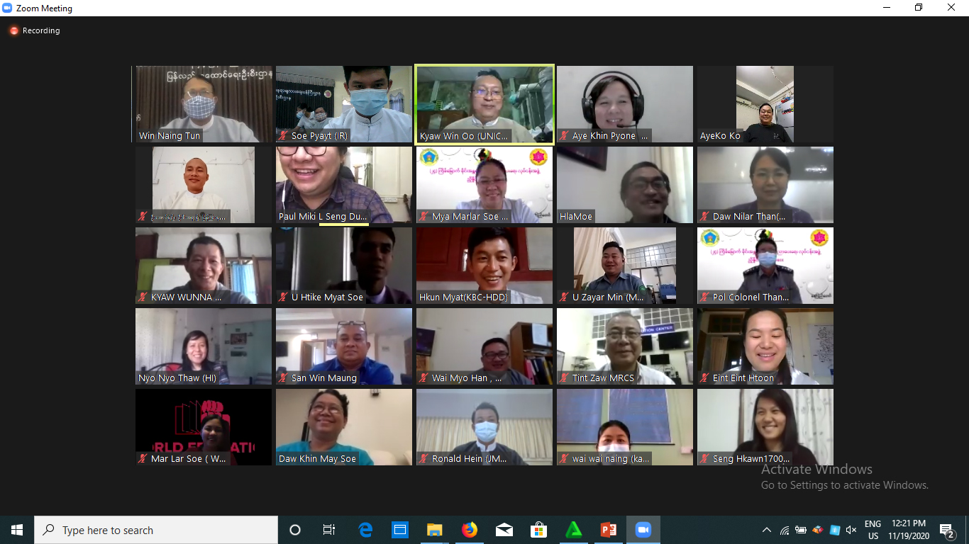 (၂၄)ကြိမ်မြောက် မိုင်းအန္တရာယ် အသိပညာပေးရေးလုပ်ငန်းအဖွဲ့ ပုံမှန်ညှိနှိုင်း အစည်းအဝေးကို ယနေ့နံနက်ပိုင်းတွင် လူမှုဝန်ထမ်း၊ ကယ်ဆယ်ရေးနှင့် ပြန်လည်နေရာချ ထားရေးဝန်ကြီးဌာန၊ ပြန်လည်ထူထောင်ရေးဦးစီးဌာန အစည်းအဝေးခန်းမ၌ Online Meeting (Zoom) ဖြင့် ကျင်းပသည်။