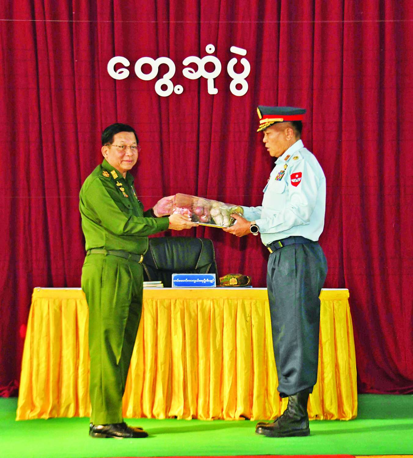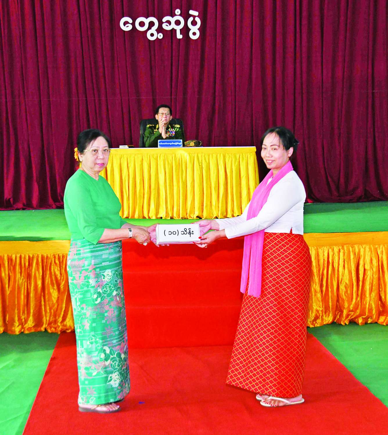 ထို့နောက် နိုင်ငံတော်လုံခြုံရေးနှင့် အေးချမ်း သာယာရေးကော်မရှင်ဥက္ကဋ္ဌ တပ်မတော်ကာကွယ်ရေးဦးစီးချုပ်က တပ်နယ်မှ အရာရှိ၊ စစ်သည်၊ မိသားစုများအတွက် စားသောက်ဖွယ်ရာပစ္စည်းများကိုပေးအပ်ရာ တပ်နယ်မှူးကလည်းကောင်း၊ နိုင်ငံတော်လုံခြုံရေးနှင့်အေးချမ်းသာယာရေးကော်မရှင်ဥက္ကဋ္ဌ တပ်မတော်ကာကွယ်ရေးဦးစီးချုပ်၏ဇနီးက တပ်နယ်မိခင်နှင့် ကလေးစောင့်ရှောက်ရေးအသင်းအတွက် ချီးမြှင့်ငွေများကိုပေးအပ်ရာ တပ်နယ်မှူး၏ဇနီးကလည်းကောင်း လက်ခံရယူသည်။