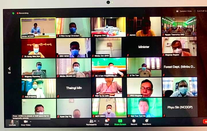 မကွေးတိုင်းဒေသကြီး မင်းဘူးခရိုင် ငဖဲမြို့နယ် လူထုဗဟိုပြုစီမံကိန်း မိတ်ဆက်ခြင်း အလုပ်ရုံ ဆွေးနွေးပွဲကို Video Conferencing စနစ်ဖြင့် နိုဝင်ဘာလ ၁၉ ရက် ယနေ့နံနက် ၉ နာရီခွဲက ဆောင်ရွက်ခဲ့ရာ မကွေးတိုင်းဒေသကြီး ဝန်ကြီးချုပ် ဒေါက်တာအောင်မိုးညို online ဖြင့် တက်ရောက်၍ အဖွင့်အမှာစကား ပြောကြားခဲ့သည်။