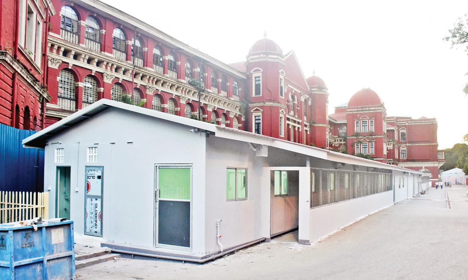 အဲဒီမှာရှိတဲ့ အရေးပေါ်ခွဲစိတ်ခန်းကိုလည်း ကိုဗစ် အတည်ပြုလူနာတွေကို ခွဲစိတ်ကုသဖို့အတွက် ပြင်ဆင် ဆောင်ရွက်ခဲ့ပါတယ်။ အဲဒါတွေကတော့ အရေးပေါ်မှာ ပြင်ဆင်ခဲ့ရတဲ့ ဌာနတွေဖြစ်ပါတယ်။ အဲဒီထဲမှာ လူနာတွေ များလာရင် အဆောင်တစ်ခုတည်ဆောက်ရတယ်။ ပင်မ အနီဆောင်ကြီး တစ်ခုလုံးကို ကိုဗစ်လူနာတွေထားဖို့ ပြင်ဆင်တဲ့အချိန်မှာ အောက်ဆုံးမြေညီထပ်မှာ သံသယလူနာတွေထားခဲ့ပြီး ပထမထပ်ကနေစပြီး အပေါ်ဆုံးထပ် အထိ အရင်က ၅/၆ အရိုးကုသဆောင်ကို ICU နဲ့ HDU လူနာ ၃၀ အတွက် ပြင်ဆင်ရပါတယ်။ စက်ကိရိယာအပြည့်အစုံ ထားပေးထားပါတယ်။